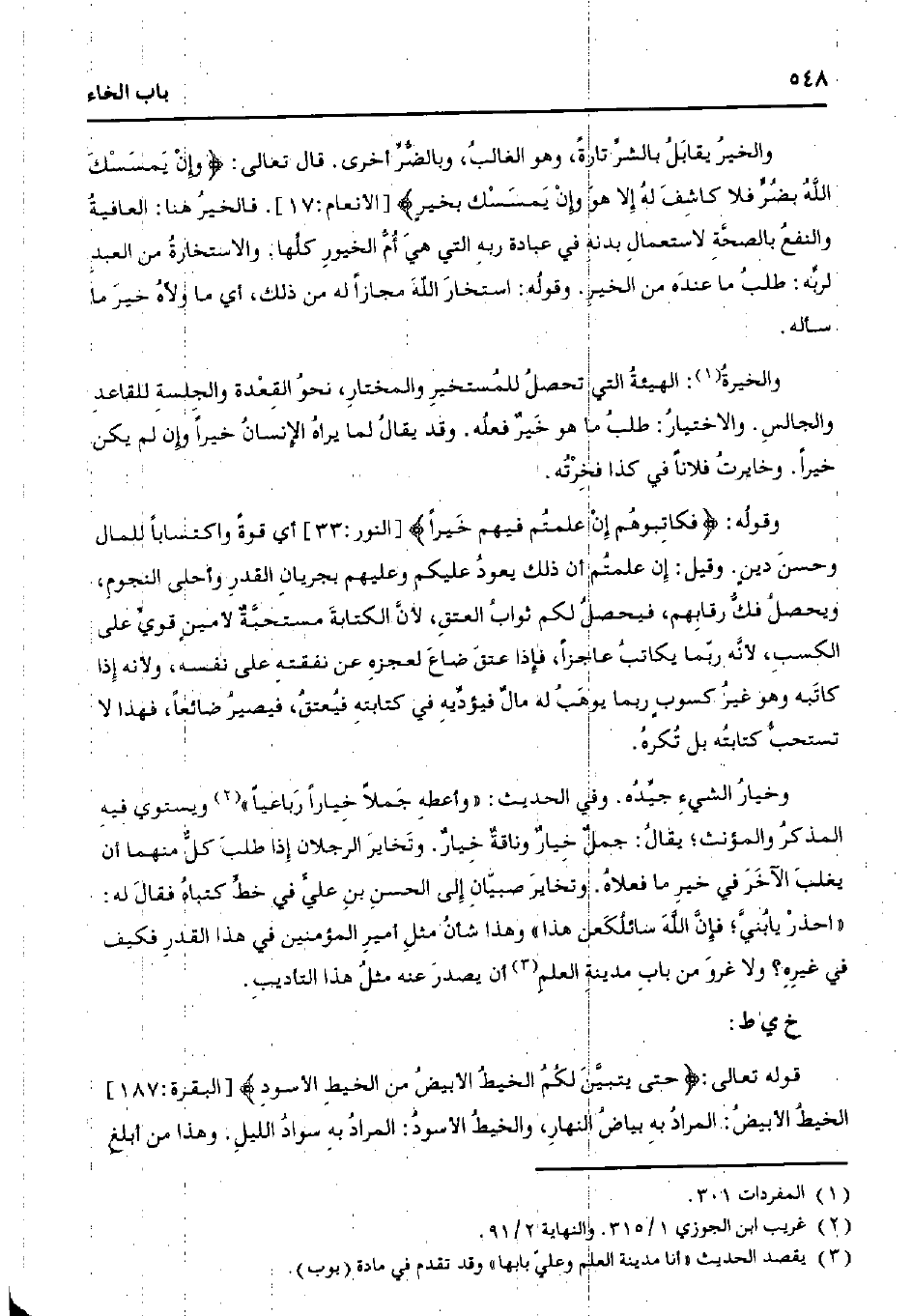 وخيار الشيء جيده. وفي الحديث: "وأعطه جملاً خيارًا رباعيًا" ويستوي فيه المذكر والمؤنث؛ يقال: جمل خيار وناقة خيار. وتخاير الرجلان إذا طلب كل منهما أن يغلب الآخر في خير ما فعلاه. وتخاير صبيان إلى الحسن بن علي في خط كتباه فقال له: "احذر يابني؛ فإن الله سائلك عن هذا" وهذا شأن مثل أمير المؤمنين في هذا القدر فكيف في غيره؟ ولا غرو من باب مدينة العلم أن يصدر عنه مثل هذا التأديب.