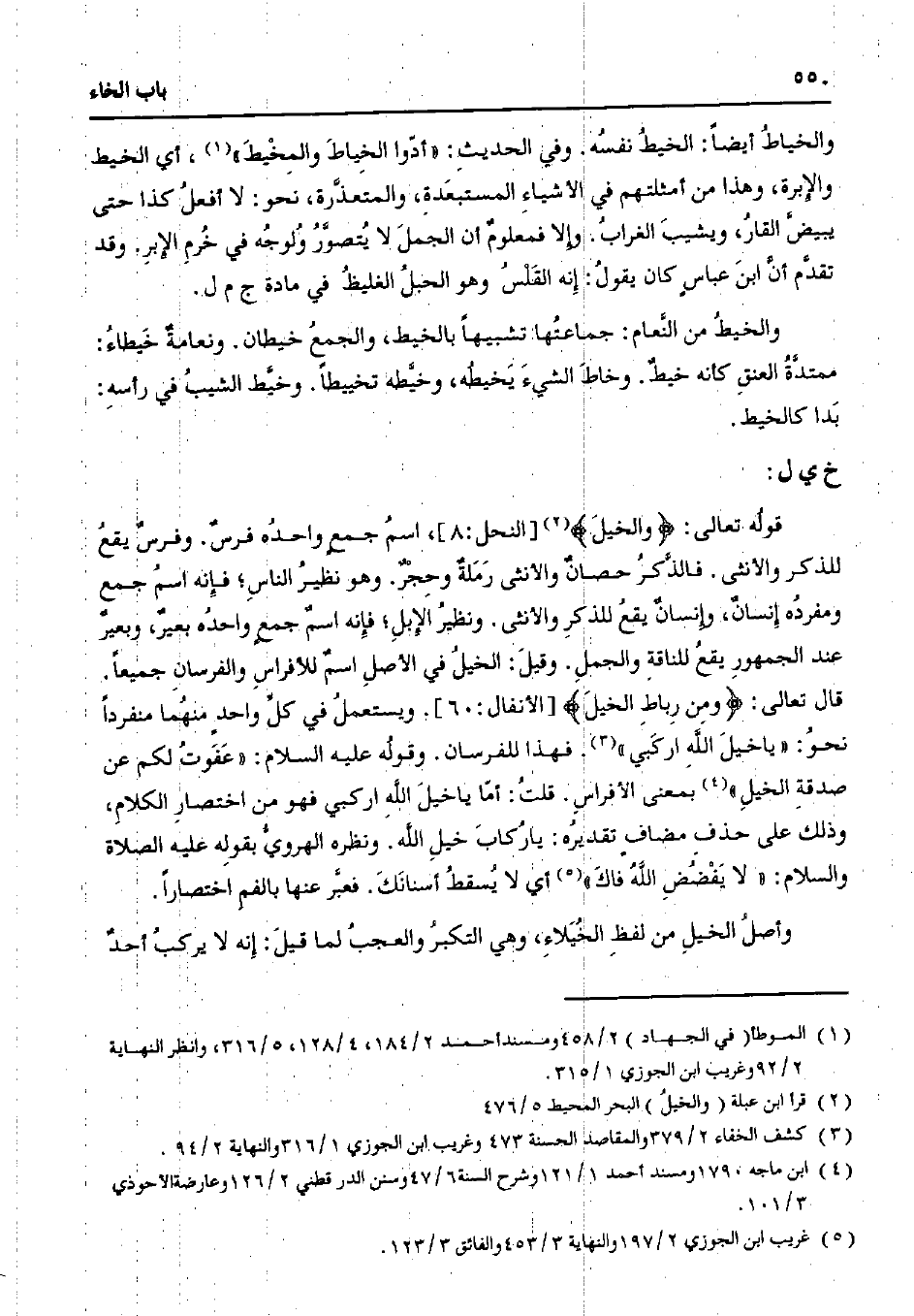 قوله تعالى: {والخيل} [النحل: 8]، اسم جمعٍ واحده فرس. وفرسٌ يقع للذكر والأنثى. فالذكر حصان والأنثى رملة وحجر. وهو نظير الناس؛ فإنه اسم جمع ومفرده إنسان، وإنسان يقع للذكر والأنثى. ونظير الإبل؛ فإنه اسم جمعٍ واحده بعير، وبعير عند الجمهور يقع للناقة والجمل. وقيل: الخيل في الأصل اسم للأفراس والفرسان جميعًا. قال تعالى: {ومن رباط الخيل} [الأنفال: 60]. ويستعمل في كل واحدٍ منهما منفردًا نحو: "ياخيل الله اركبي". فهذا للفرسان. وقوله عليه السلام: "عفوت لكم عن صدقة الخيل" بمعنى الأفراس. قلت: أما يا خيل الله اركبي فهو من اختصار الكلام، وذلك على حذف مضافٍ تقديره: ياركاب خيل الله. ونظره الهروي بقوله عليه الصلاة والسلام: "لا يفضض الله فاك" أي لا يسقط أسنانك. فعبر عنها بالفم اختصارًا.