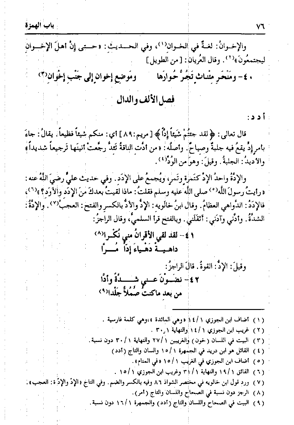 قال تعالى: {لقد جئتُمْ شَيئًا إدًّا} [مريم: 89] أي: منكم شيئًا فظيعًا. يقالُ: جاءَ بأمرٍ إدٍّ يقعُ فيه جلبةٌ وصِياحٌ. وأصلُه: «من أدَّتِ الناقةُ تَئِدُّ رجَّعتْ أنينَها تَرجيعًا شديدًا» والأديدُ: الجلبةُ. وقيلَ: وهوَ من الوُدِّ.