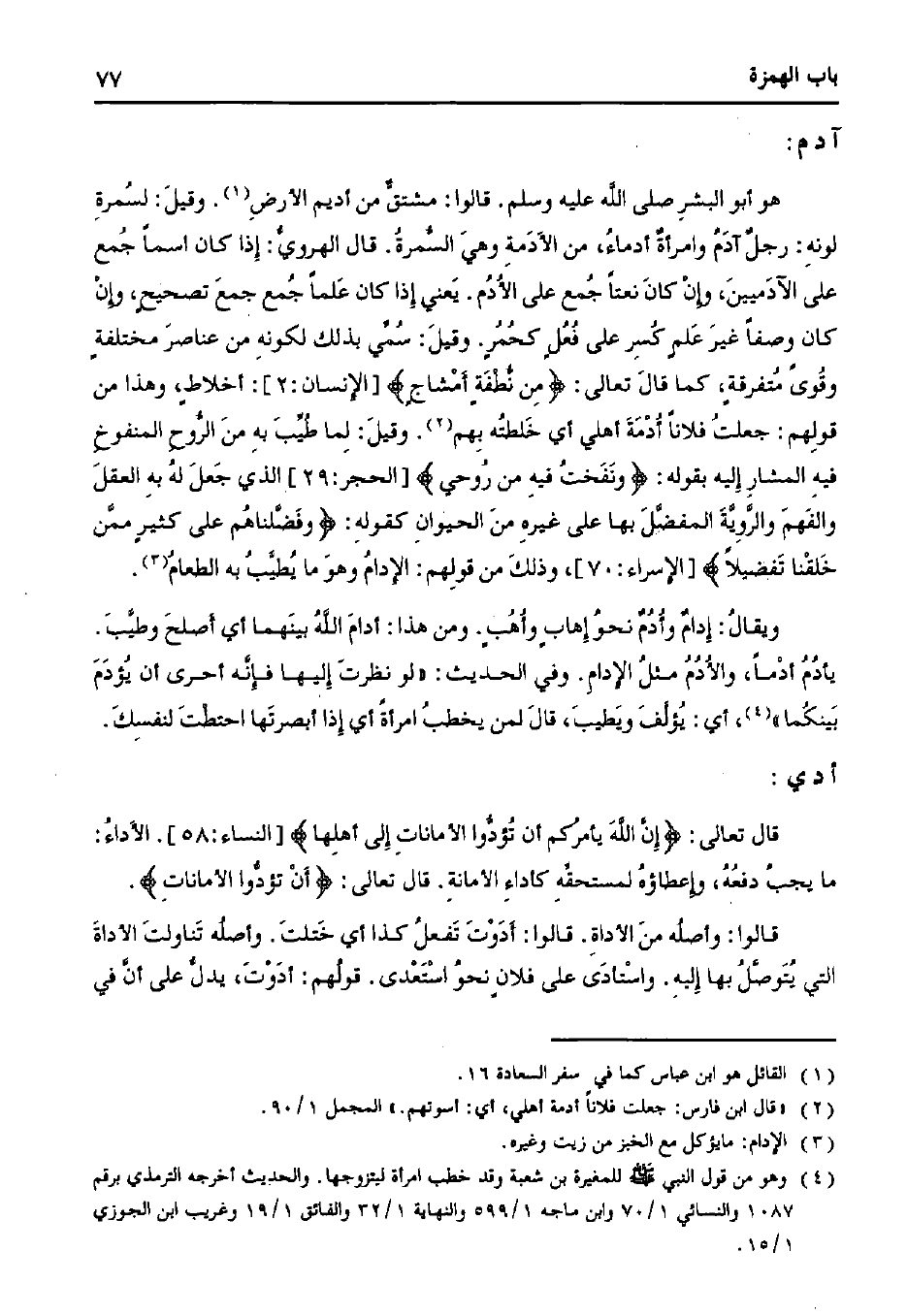 هو أبو البشرِ صلى الله عليه وسلم. قالوا: مشتقٌّ من أَديم الأرضِ. وقيلَ: لسُمرةِ لونهِ: رجلٌ آدَمُ وامرأةٌ أدماءُ، من الأَدَمةِ وهيَ السُّمرةُ. قال الهرويُّ: إذا كان اسمًا جُمع على الآدَميينَ، وإنْ كانَ نعتًا جُمع على الأُدُم. يُعني إذا كان عَلمًا جُمع جمعَ تصحيحٍ، وإنْ كان وصفًا غيرَ عَلمٍ كُسِر على فُعُلٍ كحُمُرٍ. وقيلَ: سُمِّي بذلك لكونهِ من عناصرَ مختلفةٍ وقُوىً مُتفرقةٍ، كما قالَ تعالى: {مِن نُّطْفَةٍ أَمْشاجٍ} [الإنسان: 2]: أخلاطٍ، وهذا من قولِهم: جعلتُ فلانًا أُدْمَةَ أهلي أي خَلطتُه بِهم. وقيلَ: لِما طٌيِّبَ بهِ منَ الرُّوحِ المنفوخِ فيهِ المشارِ إليه بقوله: {ونَفَختُ فيهِ من رُوحي} [الحجر: 29] الذي جَعلَ لهُ بهِ العقلَ والفَهمَ والرَّوِيَّةَ المفضَّلَ بها على غيرهِ منَ الحيوانِ كقولهِ: وفَضَّلناهُم على كثيرٍ ممَّن خَلقْنا تَفضيلاً} [الإسراء: 70]، وذلكَ من قولِهم: الإدامُ وهوَ ما يُطيَّبُ به الطعامُ.