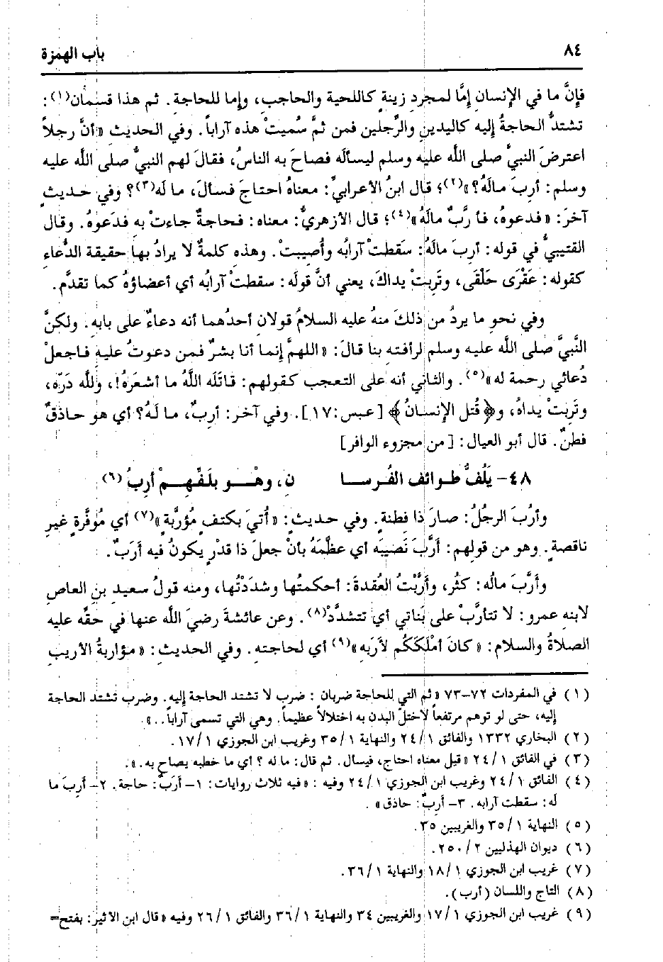 فإنَّ ما في الإنسانِ إمَّا لمجردِ زينةٍ كاللحية والحاجبِ، وإما للحاجةِ. ثم هذا قسمان: تشتدُّ الحاجةُ إليه كاليدينِ والرِّجلين فمن ثمَّ سُميتْ هذه آرابًا. وفي الحديث: «أنَّ رجلاً اعترضَ النبيَّ صلى الله عليه وسلم ليسألَه فصاحَ به الناسُ، فقالَ لهم النبيُّ صلى لله عليه وسلم: أرِبَ مالَهُ؟»؛ قال ابنُ الأعرابي: معناهُ احتاجَ فسألَ، ما لَه؟ وفي حديثٍ آخرَ: «فدعوهُ، فأرَّبٌ مالَهُ»؛ قال الأزهريُّ: معناه: فحاجةٌ جاءتْ بهِ فدَعوهُ. وقال القتيبيُّ في قوله: أرِبَ مالَهُ: سَقطتْ آرابُه وأُصِيبتْ. وهذهِ كلمةٌ لا يرادُ بها حقيقة الدُّعاء كقوله: عَقْرَى حَلْقَى، وتَرِبتْ يداكَ، يعني أنَّ قولَه: سقطتْ آرابُه أي أعضاؤهُ كما تقدَّم.