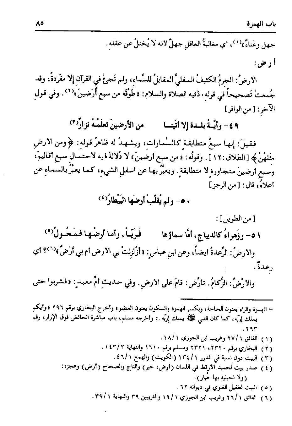 فقيلَ: إنها سبعٌ متطابقةٍ كالسَّماواتِ، ويشهدُ له ظاهرُ قولهِ: {ومن الأرضِ مِثلَهُنَّ} [الطلاق: 12]. وقولُه: «من سبع أرضينَ» لا دَلالةَ فيه لاحتمالِ سبعِ أقاليمَ، وسبعِ أرضينَ متجاورةٍ لا متطابقةٍ. ويعبَّرُ بها عن أسفلِ الشيءِ، كما يعبَّرُ بالسماءِ عن أعلاه، قال: [من الرجز]
