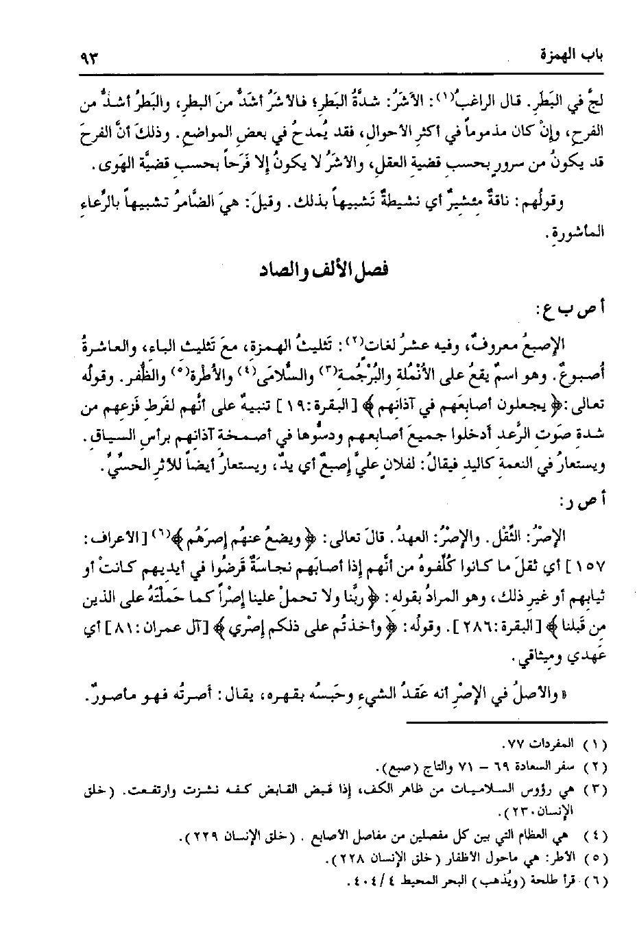 الإصبعُ معروفٌ، وفيه عشرُ لغاتٍ: تَثليثُ الهمزةِ، معَ تَثليثِ الباءِ، والعاشرةُ أُصبوعٌ. وهو اسمٌ يقعُ على الأُنْمُلةِ والبُرْجُمةِ والسُّلامَى والأُطْرة والظُّفر. وقولُه تعالى: {يجعلون أصابِعَهم في آذانِهم} [البقرة: 19] تنبيهٌ على أنهم لفَرطِ فَزعِهم من شدةِ صَوتِ الرَّعدِ أدخلوا جميعَ أصابِعهم ودسُّوها في أصمخةِ آذانهِم برأسِ السياق. ويستعارُ في النعمةِ كاليدِ فيقال: لفلانٍ عليَّ إصبعٌ أي يدٌ، ويستعارُ أيضًا للأثرِ الحسِّيِّ.