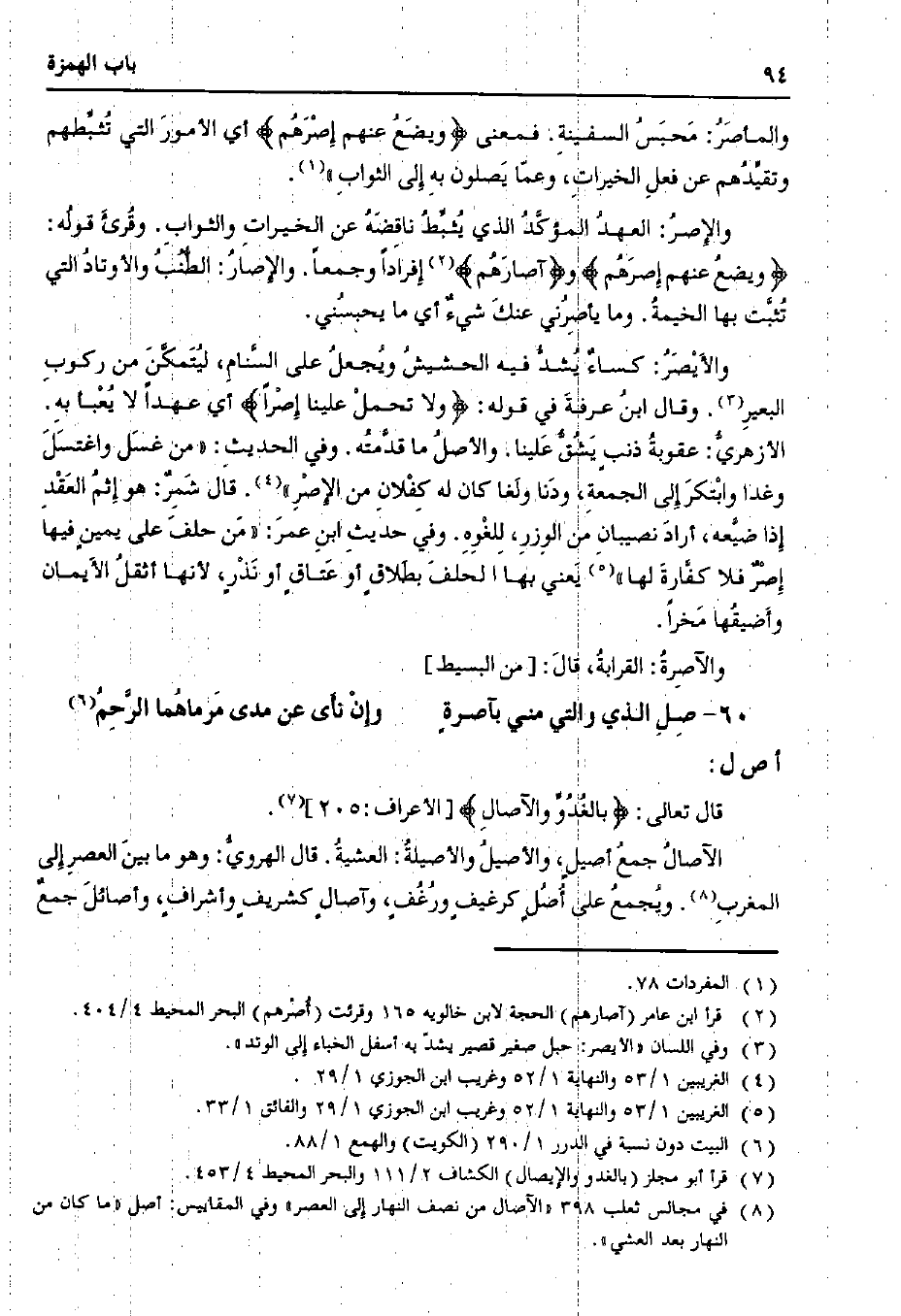 والأيصر: كساءٌ يشد فيه الحشيش ويجعل على السنام، ليتمكن من ركوب البعير. وقال ابن عرفة في قوله: {ولا تحمل علينا إصرًا} أي عهدًا لا يُعبأ به. الأزهري: عقوبة ذنبٍ يشق علينا. والأصل ما قدمته. وفي الحديث: «من غسل واغتسل وغدا وابتكر إلى الجمعة، ودنا ولغا كان له كفلان من الإصر». قال شمر: هو إثم العقد إذا ضيعه، أراد نصيبان من الوزر، للغوه. وفي حديث ابن عمر: «من حلف على يمينٍ فيها إصرٌ فلا كفارة لها» يعني بها الحلف بطلاقٍ أو عتاقٍ أو نذرٍ، لأنها أثقل الأيمان وأضيقها مخرًا.