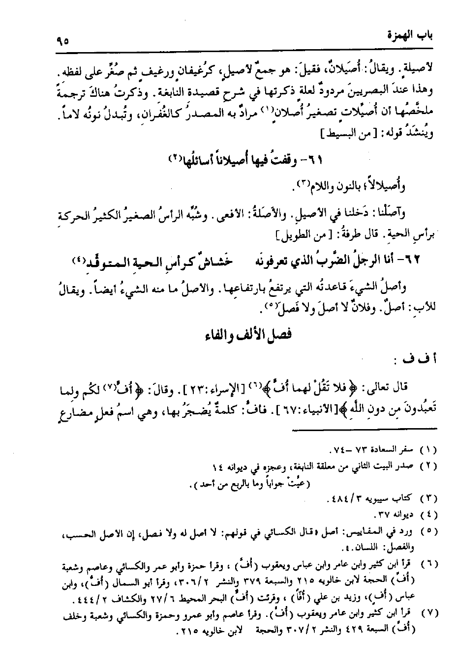 قال تعالى: {فلا تقل لهما أفٍّ} [الإسراء: 23]. وقال: {أفٍّ لكم ولما تعبدون من دون الله} [الأنبياء: 67]. فأفٍّ كلمةٌ يضجر بها، وهي اسم فعلٍ مضارعٍ