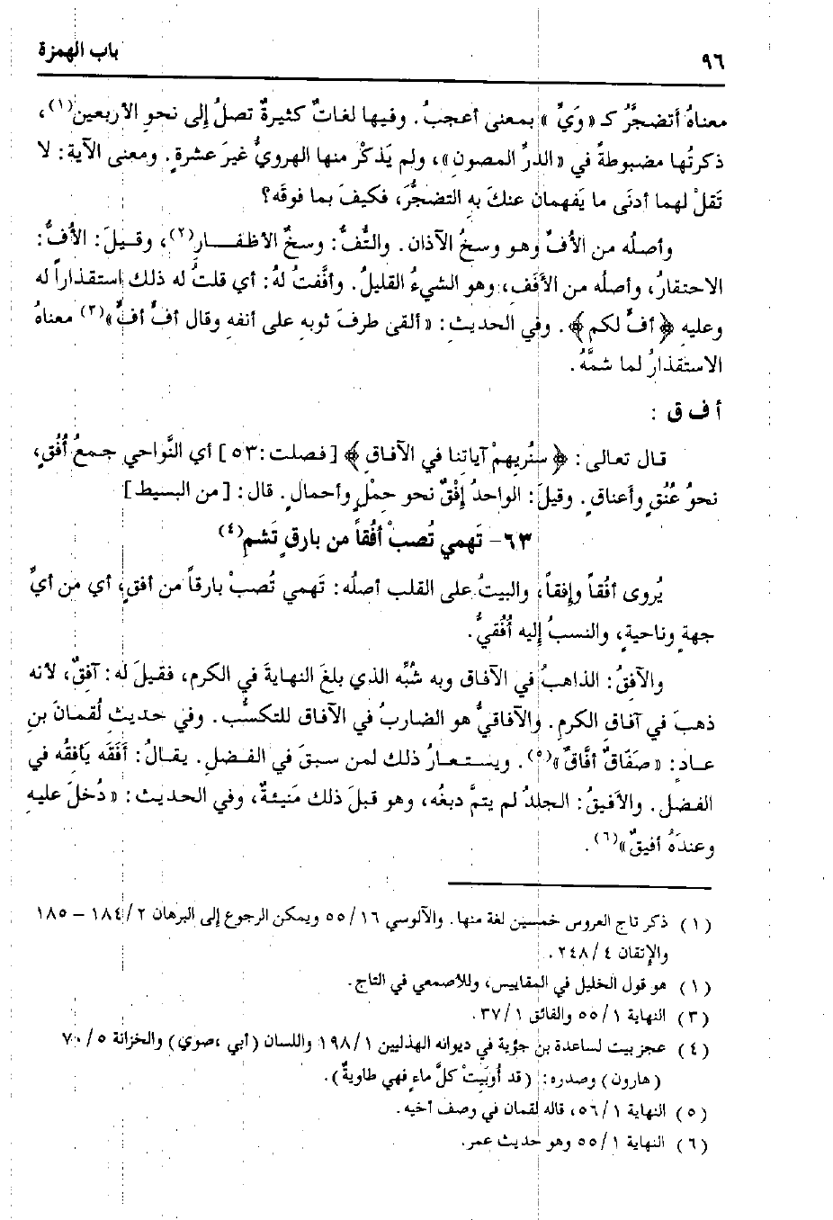 والآفق: الذاهب في الآفاق وبه شبه الذي بلغ النهاية في الكرم، فقيل له: آفق، لأنه ذهب في آفاق الكرم. والآفاقي هو الضارب في الآفاق للتكسب. وفي حديث لقمان بن عاد: «صفاق أفاق». ويستعار ذلك لمن سبق في الفضل. يقال: أفقه يأفقه في الفضل. والأفيق: الجلد لم يتم دبغه، وهو قبل ذلك منيئة، وفي الحديث: «دخل عليه وعنده أفيق».