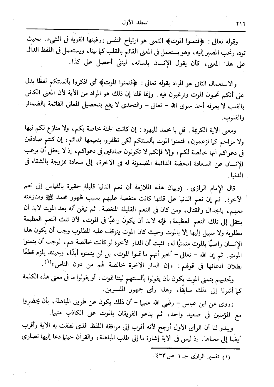 والاستعمال الثاني هو المراد بقوله تعالى: فَتَمَنَّوُا الْمَوْتَ أى اذكروا بألسنتكم لفظا يدل على أنكم تحبون الموت وترغبون فيه. وإنما قلنا إن ذلك هو المراد من الآية لأن المعنى الكائن بالقلب لا يعرفه أحد سوى الله- تعالى- والتحدي لا يقع بتحصيل المعاني القائمة بالضمائر والقلوب.