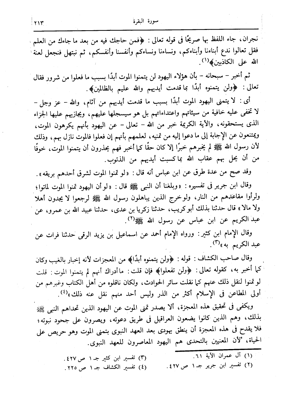وقال ابن جرير في تفسيره: «وبلغنا أن النبي صلّى الله عليه وسلّم قال: «لو أن اليهود تمنوا الموت لماتوا ولرأوا مقاعدهم من النار، ولو خرج الذين يباهلون رسول الله صلّى الله عليه وسلّم لرجعوا لا يجدون أهلا ولا مالا» قال حدثنا بذلك أبو كريب، حدثنا زكريا بن عدى، حدثنا عبيد الله بن عمرو، عن عبد الكريم عن ابن عباس عن رسول الله صلّى الله عليه وسلّم «2» .