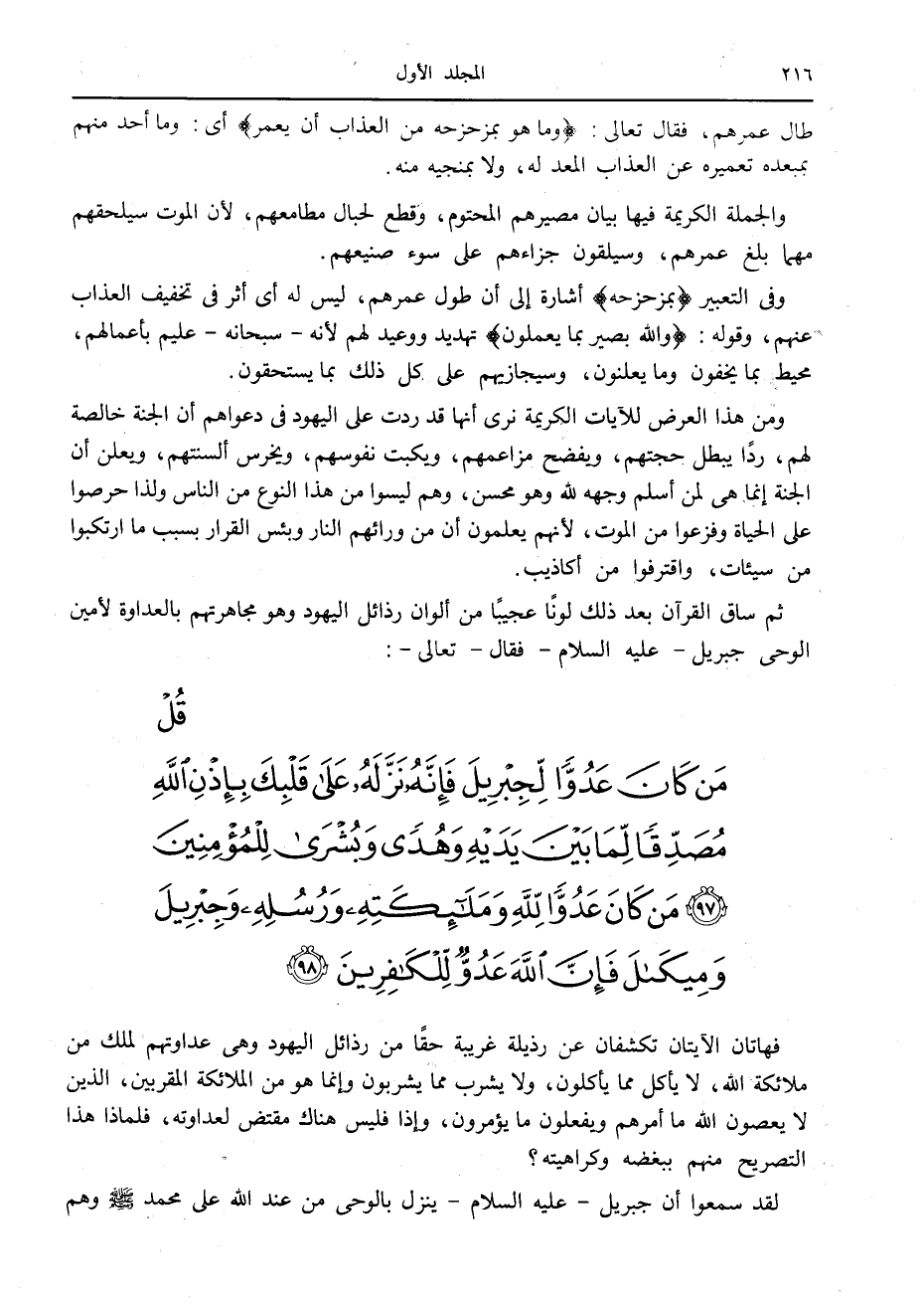 ثم ساق القرآن بعد ذلك لونا عجيبا من ألوان رذائل اليهود وهو مجاهرتهم بالعداوة لأمين الوحى جبريل- عليه السلام- فقال- تعالى-: