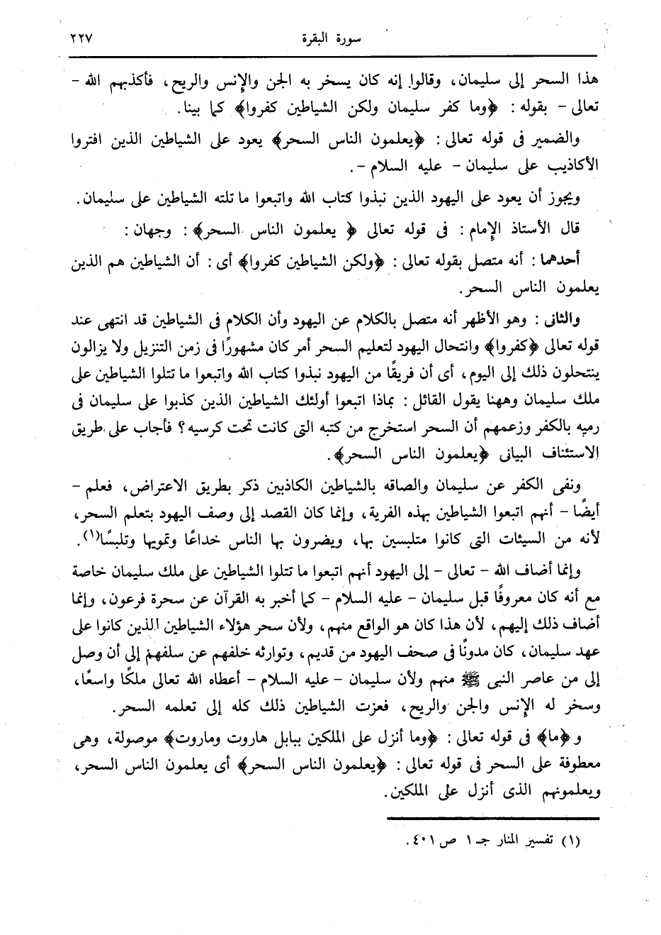 قال الأستاذ الإمام: في قوله تعالى يُعَلِّمُونَ النَّاسَ السِّحْرَ: وجهان: