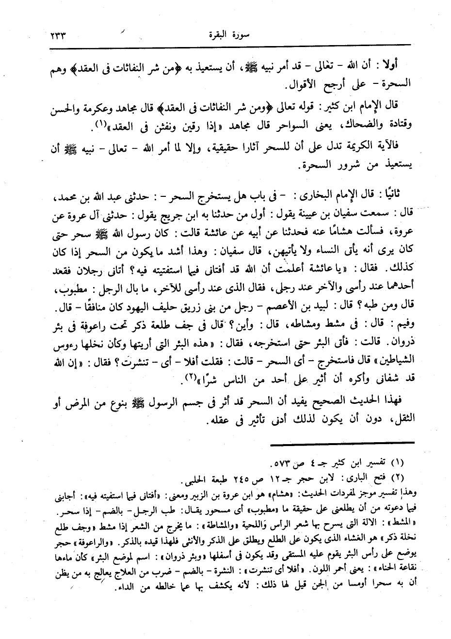 أولا: أن الله- تعالى- قد أمر نبيه صلّى الله عليه وسلّم، أن يستعيذ به مِنْ شَرِّ النَّفَّاثاتِ فِي الْعُقَدِ وهم السحرة- على أرجح الأقوال.
