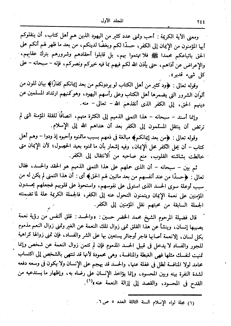 قال فضيلة المرحوم الشيخ محمد الخضر حسين: «والحسد: قلق النفس من رؤية نعمة يصيبها إنسان، وينشأ عن هذا القلق تمنى زوال تلك النعمة عن الغير وتمنى زوال النعم مذموم بكل لسان، إلا نعمة أصابها فاجر أو جائر يستعين بها على الشر والفساد، فإن تمنى زوالها كراهية للجور والفساد لا يدخل في قبيل الحسد المذموم فإن لم تتمن زوال النعمة عن شخص وإنما تمنيت لنفسك مثلها فيه الغبطة والمنافسة، وهي محمودة لأنها قد تنتهي بالشخص إلى اكتساب محامد لولا المنافسة لظل في غفلة عنها، والحسد قد يهجم على الإنسان ولا يكون في وسعه دفعه لشدة النفرة بينه وبين المحسود، وإنما يؤاخذ الإنسان على رضاه به، وإظهار ما يستدعيه من القدح في المحسود، والقصد إلى إزالة النعمة عنه» «1» .