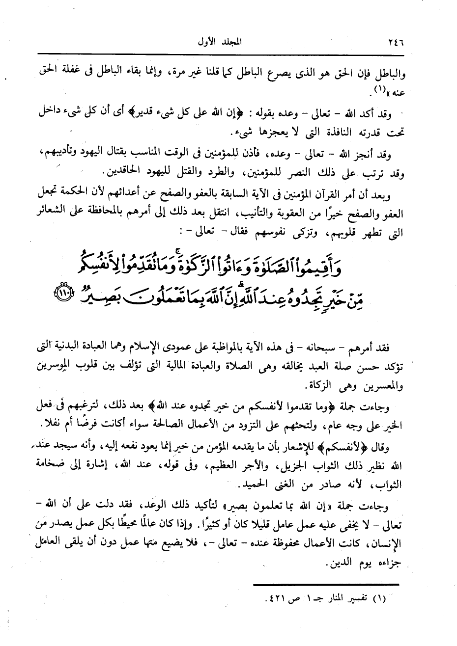 وَأَقِيمُوا الصَّلاةَ وَآتُوا الزَّكاةَ وَما تُقَدِّمُوا لِأَنْفُسِكُمْ مِنْ خَيْرٍ تَجِدُوهُ عِنْدَ اللَّهِ إِنَّ اللَّهَ بِما تَعْمَلُونَ بَصِيرٌ (110)