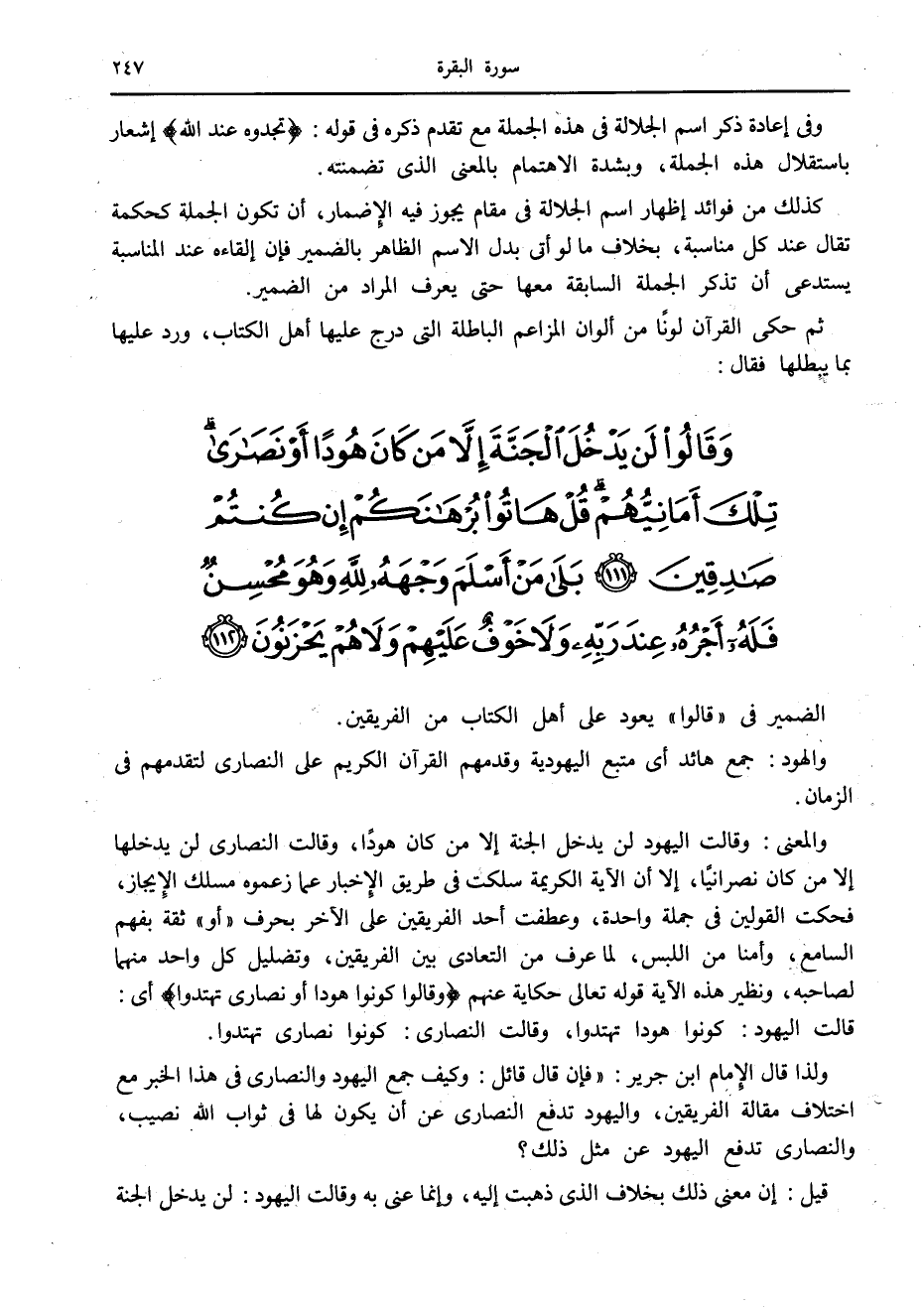 وَقالُوا لَنْ يَدْخُلَ الْجَنَّةَ إِلاَّ مَنْ كانَ هُوداً أَوْ نَصارى تِلْكَ أَمانِيُّهُمْ قُلْ هاتُوا بُرْهانَكُمْ إِنْ كُنْتُمْ صادِقِينَ (111) بَلى مَنْ أَسْلَمَ وَجْهَهُ لِلَّهِ وَهُوَ مُحْسِنٌ فَلَهُ أَجْرُهُ عِنْدَ رَبِّهِ وَلا خَوْفٌ عَلَيْهِمْ وَلا هُمْ يَحْزَنُونَ (112)
