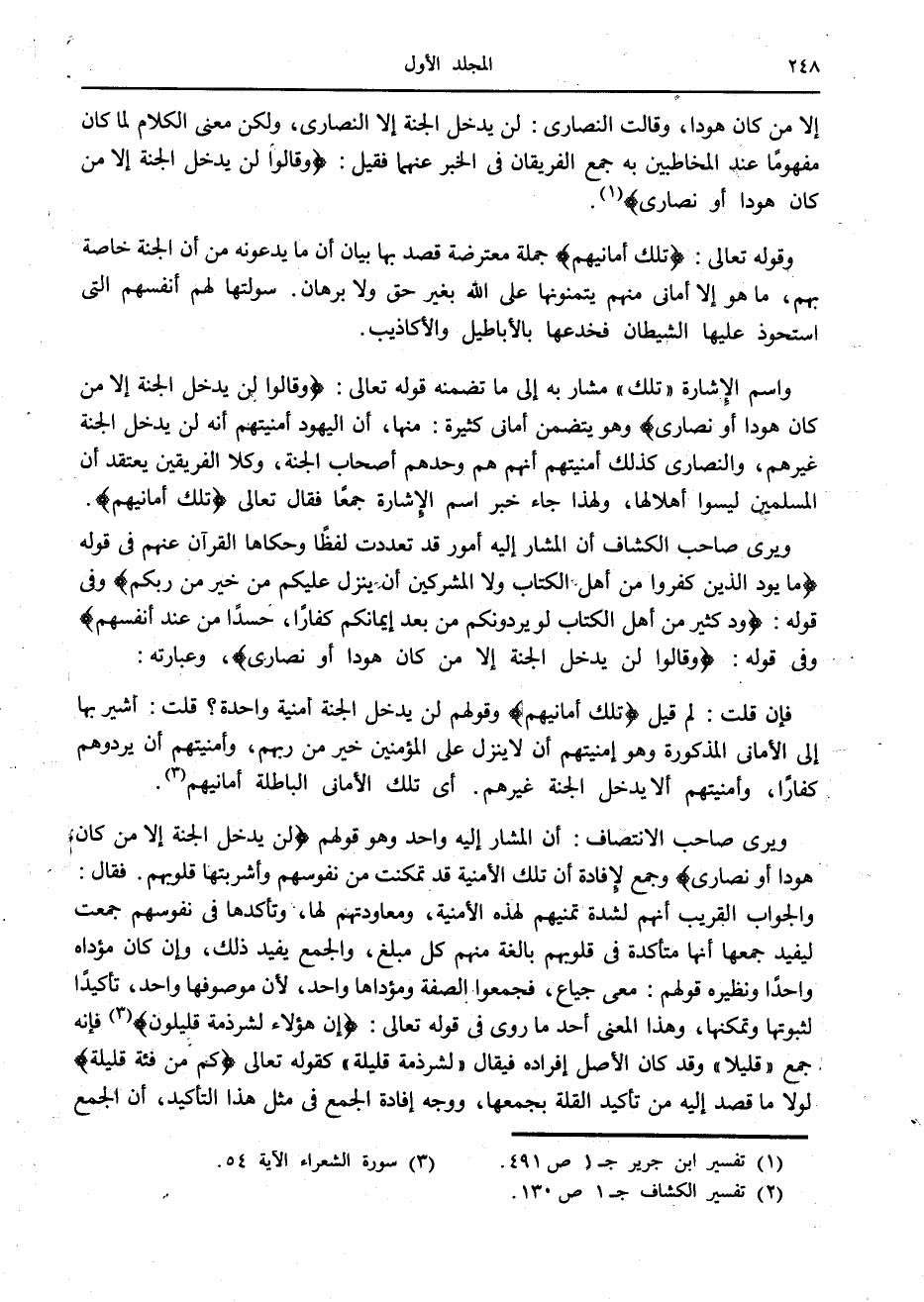 واسم الإشارة «تلك» مشار به إلى ما تضمنه قوله تعالى: وَقالُوا لَنْ يَدْخُلَ الْجَنَّةَ إِلَّا مَنْ كانَ هُوداً أَوْ نَصارى وهو يتضمن أمانى كثيرة: منها، أن اليهود أمنيتهم أنه لن يدخل الجنة غيرهم، والنصارى كذلك أمنيتهم أنهم هم وحدهم أصحاب الجنة، وكلا الفريقين يعتقد أن المسلمين ليسوا أهلا لها، ولهذا جاء خبر اسم الإشارة جمعا فقال تعالى تِلْكَ أَمانِيُّهُمْ.