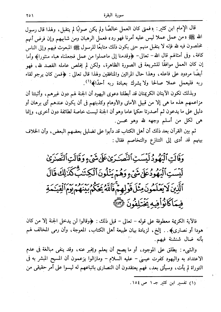 وَقالَتِ الْيَهُودُ لَيْسَتِ النَّصارى عَلى شَيْءٍ وَقالَتِ النَّصارى لَيْسَتِ الْيَهُودُ عَلى شَيْءٍ وَهُمْ يَتْلُونَ الْكِتابَ كَذلِكَ قالَ الَّذِينَ لا يَعْلَمُونَ مِثْلَ قَوْلِهِمْ فَاللَّهُ يَحْكُمُ بَيْنَهُمْ يَوْمَ الْقِيامَةِ فِيما كانُوا فِيهِ يَخْتَلِفُونَ (113)