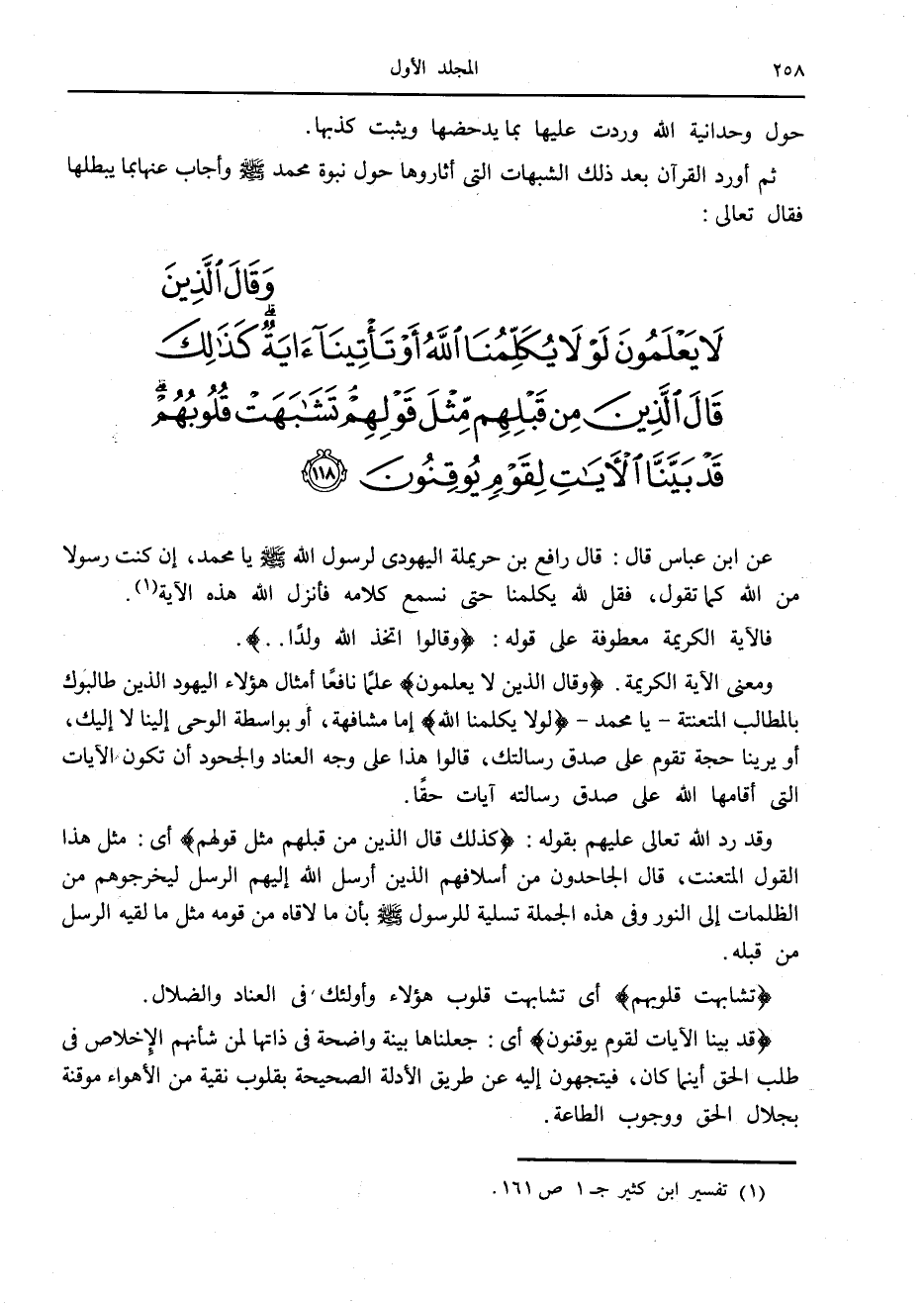 وَقالَ الَّذِينَ لا يَعْلَمُونَ لَوْلا يُكَلِّمُنَا اللَّهُ أَوْ تَأْتِينا آيَةٌ كَذلِكَ قالَ الَّذِينَ مِنْ قَبْلِهِمْ مِثْلَ قَوْلِهِمْ تَشابَهَتْ قُلُوبُهُمْ قَدْ بَيَّنَّا الْآياتِ لِقَوْمٍ يُوقِنُونَ (118)