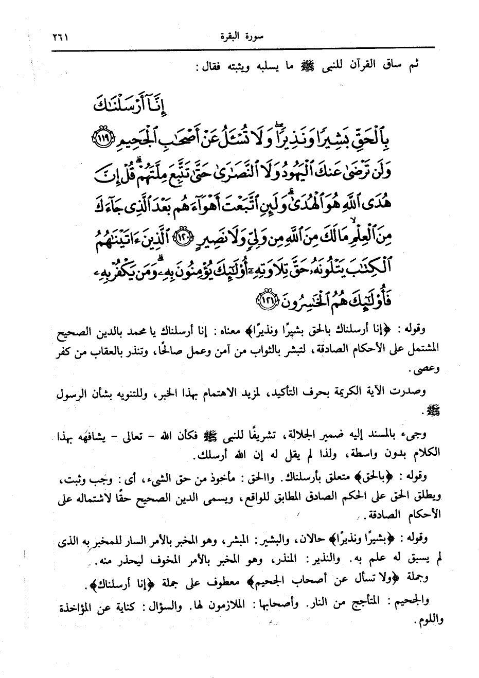 إِنَّا أَرْسَلْناكَ بِالْحَقِّ بَشِيراً وَنَذِيراً وَلا تُسْئَلُ عَنْ أَصْحابِ الْجَحِيمِ (119) وَلَنْ تَرْضى عَنْكَ الْيَهُودُ وَلا النَّصارى حَتَّى تَتَّبِعَ مِلَّتَهُمْ قُلْ إِنَّ هُدَى اللَّهِ هُوَ الْهُدى وَلَئِنِ اتَّبَعْتَ أَهْواءَهُمْ بَعْدَ الَّذِي جاءَكَ مِنَ الْعِلْمِ ما لَكَ مِنَ اللَّهِ مِنْ وَلِيٍّ وَلا نَصِيرٍ (120) الَّذِينَ آتَيْناهُمُ الْكِتابَ يَتْلُونَهُ حَقَّ تِلاوَتِهِ أُولئِكَ يُؤْمِنُونَ بِهِ وَمَنْ يَكْفُرْ بِهِ فَأُولئِكَ هُمُ الْخاسِرُونَ (121)