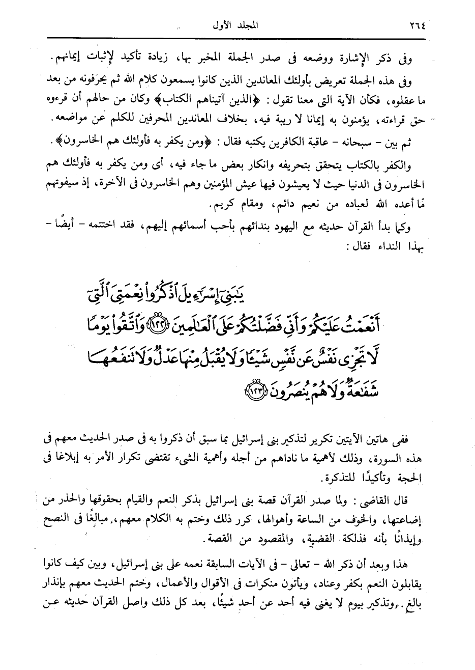 يا بَنِي إِسْرائِيلَ اذْكُرُوا نِعْمَتِيَ الَّتِي أَنْعَمْتُ عَلَيْكُمْ وَأَنِّي فَضَّلْتُكُمْ عَلَى الْعالَمِينَ (122) وَاتَّقُوا يَوْماً لا تَجْزِي نَفْسٌ عَنْ نَفْسٍ شَيْئاً وَلا يُقْبَلُ مِنْها عَدْلٌ وَلا تَنْفَعُها شَفاعَةٌ وَلا هُمْ يُنْصَرُونَ (123)