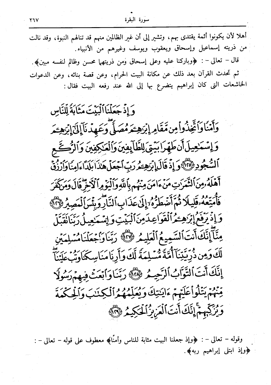 ثم تحدث القرآن بعد ذلك عن مكانة البيت الحرام، وعن قصة بنائه، وعن الدعوات الخاشعات التي كان إبراهيم يتضرع بها إلى الله عند رفعه البيت فقال: