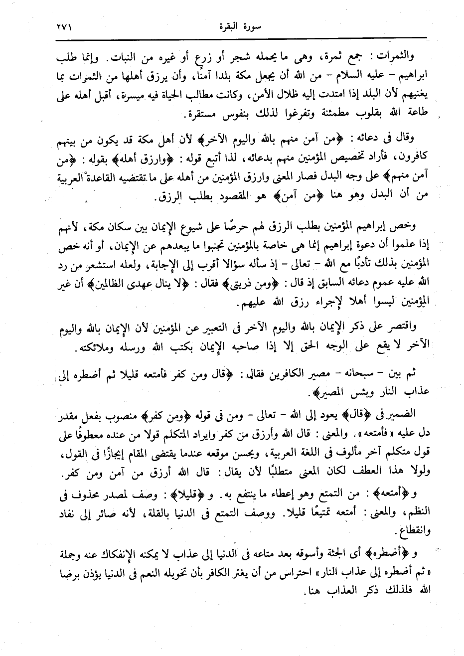 الضمير في قالَ يعود إلى الله- تعالى- ومن في قوله وَمَنْ كَفَرَ منصوب بفعل مقدر دل عليه «فأمتعه» . والمعنى: قال الله وأرزق من كفر وإيراد المتكلم قولا من عنده معطوفا على قول متكلم آخر مألوف في اللغة العربية، ويحسن موقعه عند ما يقتضى المقام إيجازا في القول، ولولا هذا العطف لكان المعنى متطلبا لأن يقال: قال الله أرزق من آمن ومن كفر.