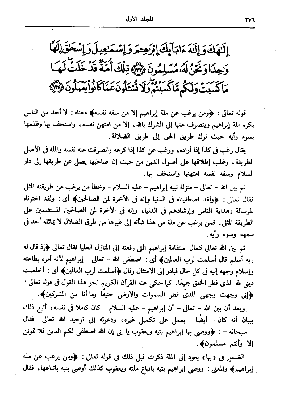 وبعد أن بين الله- تعالى- أن إبراهيم- عليه السلام- كان كاملا في نفسه، أتبع ذلك ببيان أنه كان- أيضا- يعمل على تكميل غيره، ودعوته إلى توحيد الله تعالى. فقال- سبحانه-: وَوَصَّى بِها إِبْراهِيمُ بَنِيهِ وَيَعْقُوبُ يا بَنِيَّ إِنَّ اللَّهَ اصْطَفى لَكُمُ الدِّينَ فَلا تَمُوتُنَّ إِلَّا وَأَنْتُمْ مُسْلِمُونَ.