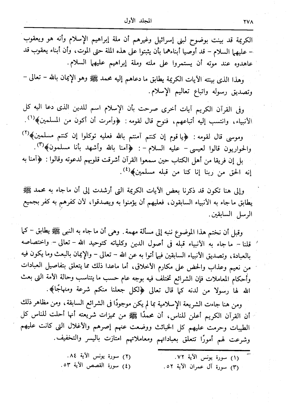 وفي القرآن الكريم آيات أخرى صرحت بأن الإسلام اسم للدين الذي دعا اليه كل الأنبياء، وانتسب إليه أتباعهم، فنوح قال لقومه: وَأُمِرْتُ أَنْ أَكُونَ مِنَ الْمُسْلِمِينَ «1» .
