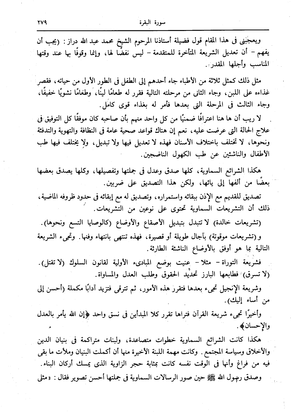 ويعجبني في هذا المقام قول فضيلة أستاذنا المرحوم الشيخ محمد عبد الله دراز: (يجب أن يفهم- أن تعديل الشريعة المتأخرة للمتقدمة- ليس نقضا لها، وإنما وقوفا بها عند وقتها المناسب وأجلها المقدر.