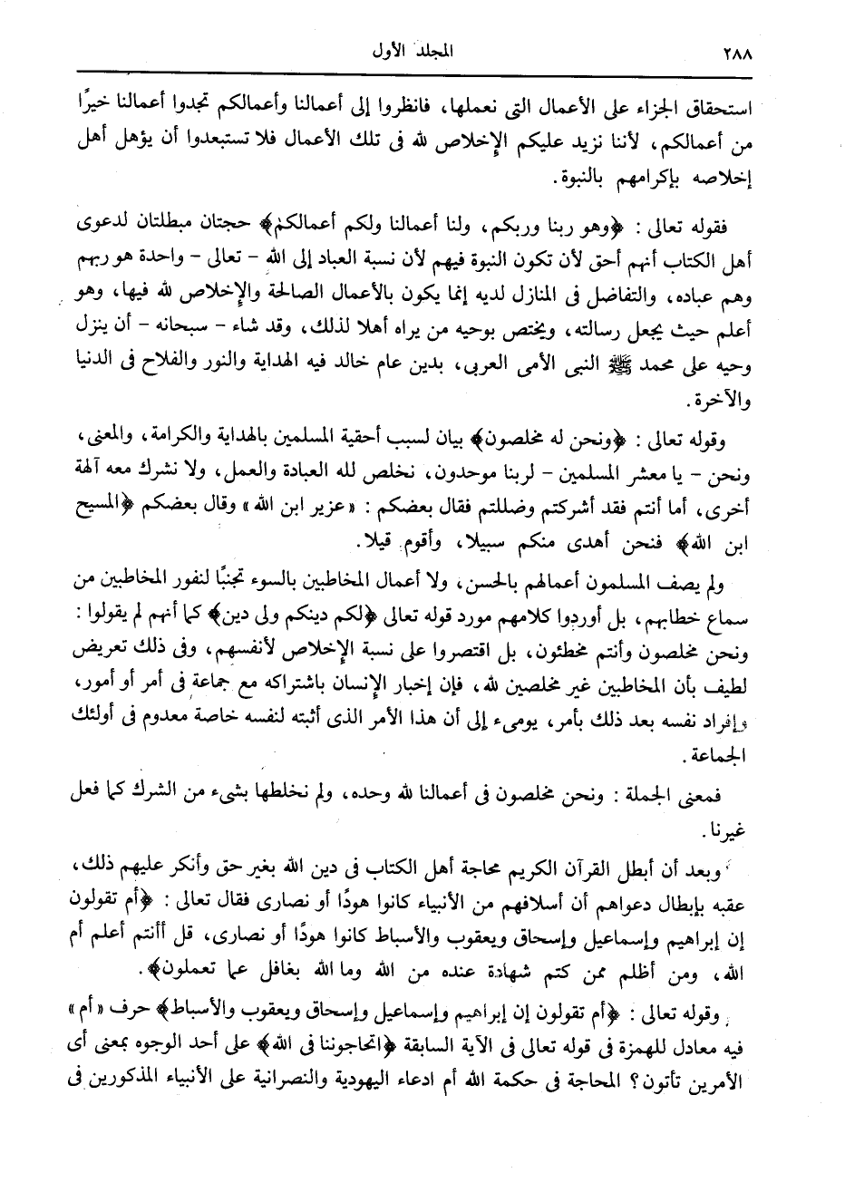 فقوله تعالى: وَهُوَ رَبُّنا وَرَبُّكُمْ، وَلَنا أَعْمالُنا وَلَكُمْ أَعْمالُكُمْ حجتان مبطلتان لدعوى أهل الكتاب أنهم أحق لأن تكون النبوة فيهم لأن نسبة العباد إلى الله- تعالى- واحدة هو ربهم وهم عباده، والتفاضل في المنازل لديه إنما يكون بالأعمال الصالحة والإخلاص لله فيها، وهو أعلم حيث يجعل رسالته، ويختص بوحيه من يراه أهلا لذلك، وقد شاء- سبحانه- أن ينزل وحيه على محمد صلّى الله عليه وسلّم النبي الأمى العربي، بدين عام خالد فيه الهداية والنور والفلاح في الدنيا والآخرة.