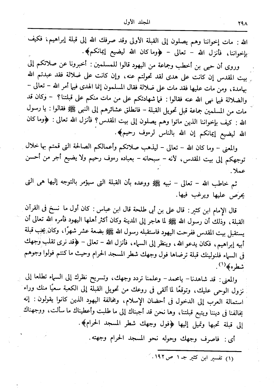 قال الإمام ابن كثير: قال على بن أبى طلحة قال ابن عباس: كان أول ما نسخ في القرآن القبلة، وذلك أن رسول الله صلّى الله عليه وسلّم لما هاجر إلى المدينة وكان أكثر أهلها اليهود فأمره الله تعالى أن يستقبل بيت المقدس ففرحت اليهود فاستقبله رسول الله صلّى الله عليه وسلّم بضعة عشر شهرا، وكان يحب قبلة أبيه إبراهيم، فكان يدعو الله، وينظر إلى السماء، فأنزل الله- تعالى- قَدْ نَرى تَقَلُّبَ وَجْهِكَ فِي السَّماءِ فَلَنُوَلِّيَنَّكَ قِبْلَةً تَرْضاها فَوَلِّ وَجْهَكَ شَطْرَ الْمَسْجِدِ الْحَرامِ وَحَيْثُ ما كُنْتُمْ فَوَلُّوا وُجُوهَكُمْ شَطْرَهُ «1» .