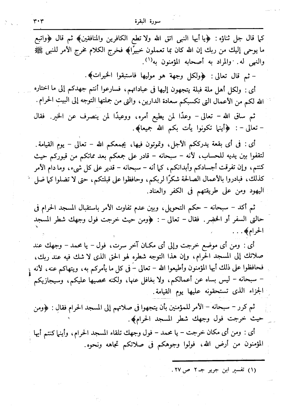 ثم أكد- سبحانه- حكم التحويل، وبين عدم تفاوت الأمر باستقبال المسجد الحرام في حالتي السفر أو الحضر. فقال- تعالى-: وَمِنْ حَيْثُ خَرَجْتَ فَوَلِّ وَجْهَكَ شَطْرَ الْمَسْجِدِ الْحَرامِ ...