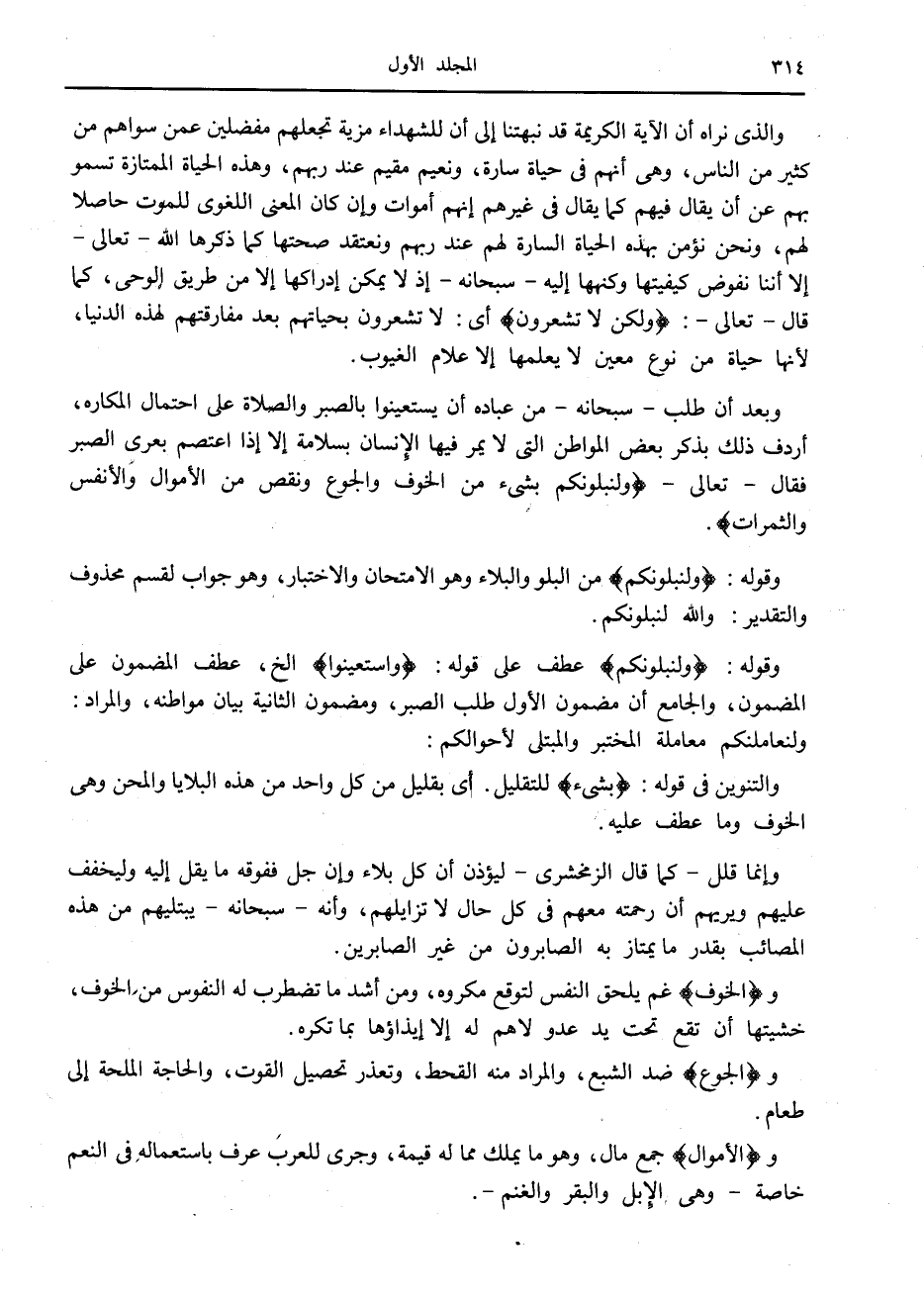 وبعد أن طلب- سبحانه- من عباده أن يستعينوا بالصبر والصلاة على احتمال المكاره، أردف ذلك بذكر بعض المواطن التي لا يمر فيها الإنسان بسلامة إلا إذا اعتصم بعرى الصبر فقال- تعالى- وَلَنَبْلُوَنَّكُمْ بِشَيْءٍ مِنَ الْخَوْفِ وَالْجُوعِ وَنَقْصٍ مِنَ الْأَمْوالِ وَالْأَنْفُسِ وَالثَّمَراتِ.