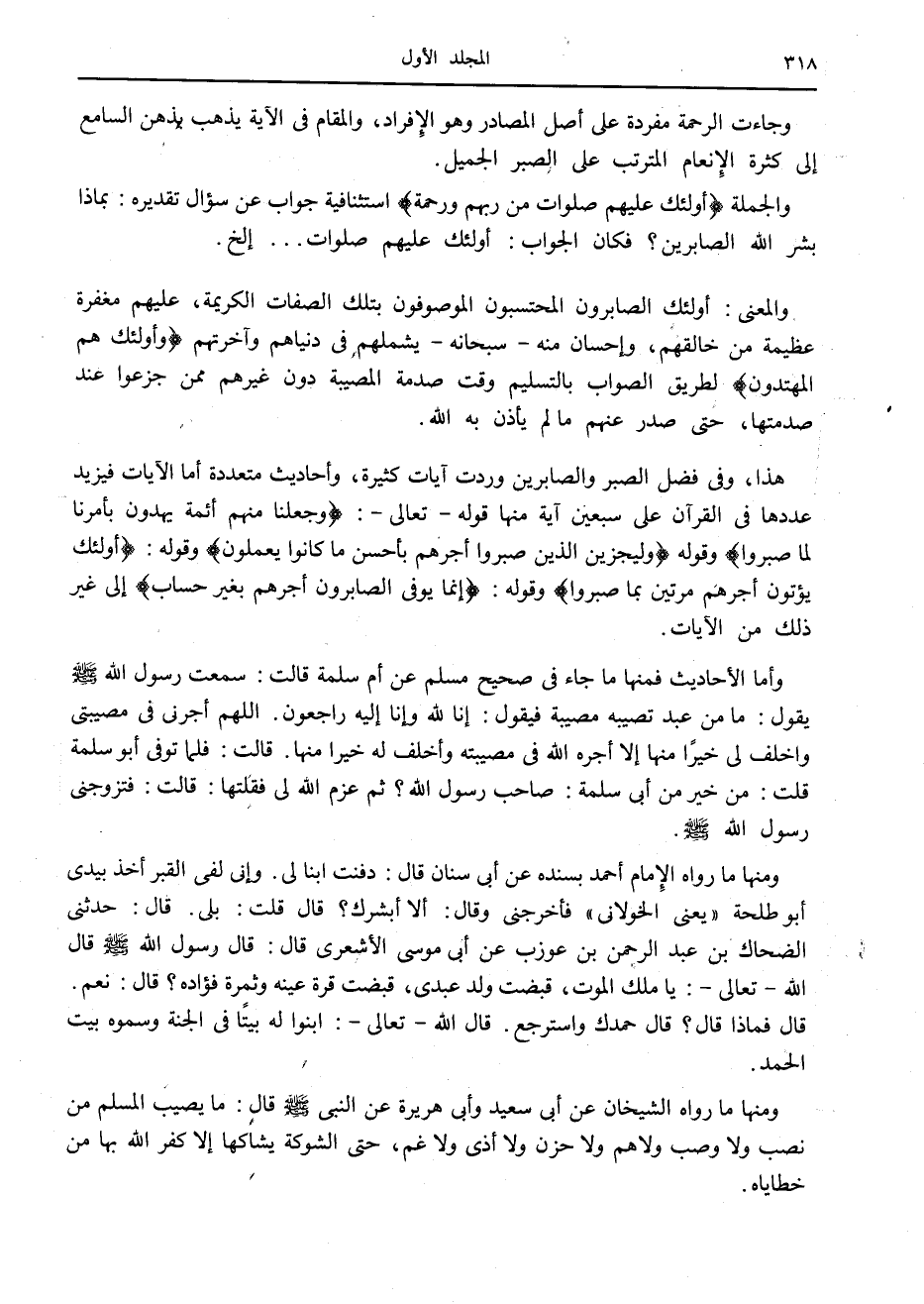 ومنها ما رواه الإمام أحمد بسنده عن أبى سنان قال: دفنت ابنا لي. وإنى لفي القبر أخذ بيدي أبو طلحة «يعنى الخولاني» فأخرجنى وقال: ألا أبشرك؟ قال قلت: بلى. قال: حدثني الضحاك بن عبد الرحمن بن عوزب عن أبى موسى الأشعرى قال: قال رسول الله صلّى الله عليه وسلّم قال الله- تعالى-: يا ملك الموت، قبضت ولد عبدى، قبضت قرة عينه وثمرة فؤاده؟ قال: نعم.