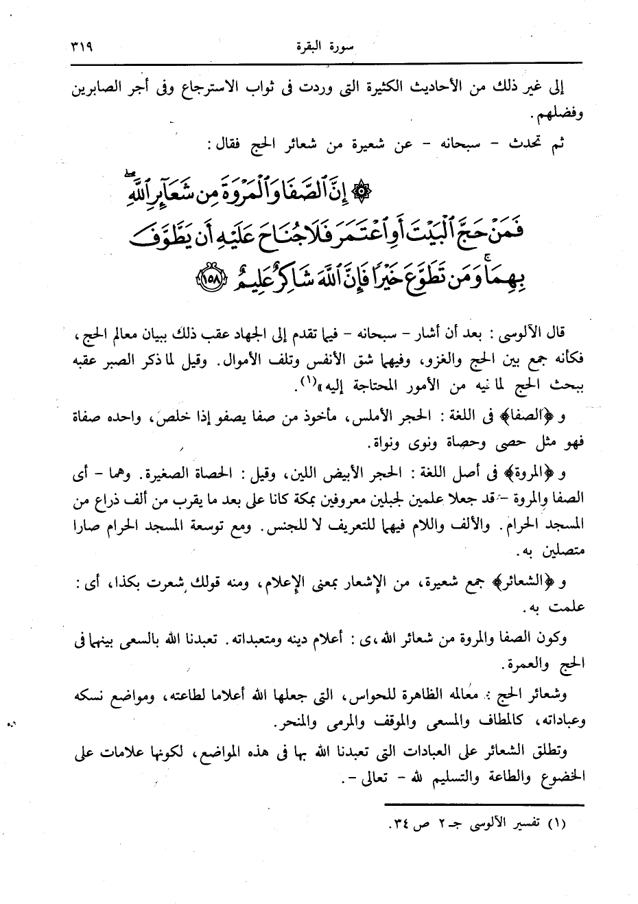 إِنَّ الصَّفا وَالْمَرْوَةَ مِنْ شَعائِرِ اللَّهِ فَمَنْ حَجَّ الْبَيْتَ أَوِ اعْتَمَرَ فَلا جُناحَ عَلَيْهِ أَنْ يَطَّوَّفَ بِهِما وَمَنْ تَطَوَّعَ خَيْراً فَإِنَّ اللَّهَ شاكِرٌ عَلِيمٌ (158)