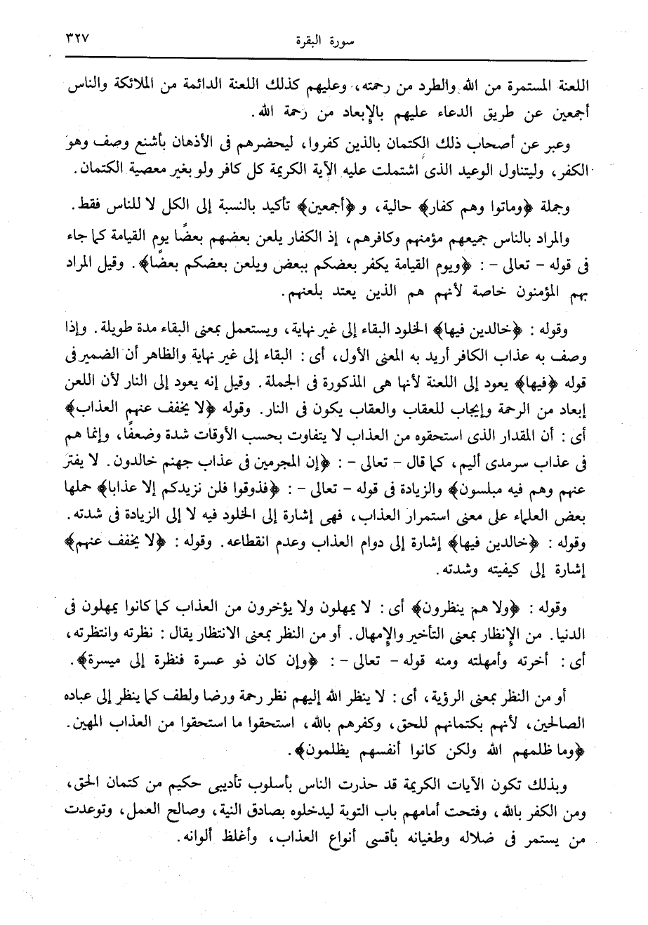 وقوله: خالِدِينَ فِيها الخلود البقاء إلى غير نهاية، ويستعمل بمعنى البقاء مدة طويلة. وإذا وصف به عذاب الكافر أريد به المعنى الأول، أى: البقاء إلى غير نهاية والظاهر أن الضمير في قوله فِيها يعود إلى اللعنة لأنها هي المذكورة في الجملة. وقيل إنه يعود إلى النار لأن اللعن إبعاد من الرحمة وإيجاب للعقاب والعقاب يكون في النار. وقوله لا يُخَفَّفُ عَنْهُمُ الْعَذابُ أى: أن المقدار الذي استحقوه من العذاب لا يتفاوت بحسب الأوقات شدة وضعفا، وإنما هم في عذاب سرمدي أليم، كما قال- تعالى-: إِنَّ الْمُجْرِمِينَ فِي عَذابِ جَهَنَّمَ خالِدُونَ. لا يُفَتَّرُ عَنْهُمْ وَهُمْ فِيهِ مُبْلِسُونَ والزيادة في قوله- تعالى- فَذُوقُوا فَلَنْ نَزِيدَكُمْ إِلَّا عَذاباً حملها بعض العلماء على معنى استمرار العذاب، فهي إشارة إلى الخلود فيه لا إلى الزيادة في شدته.