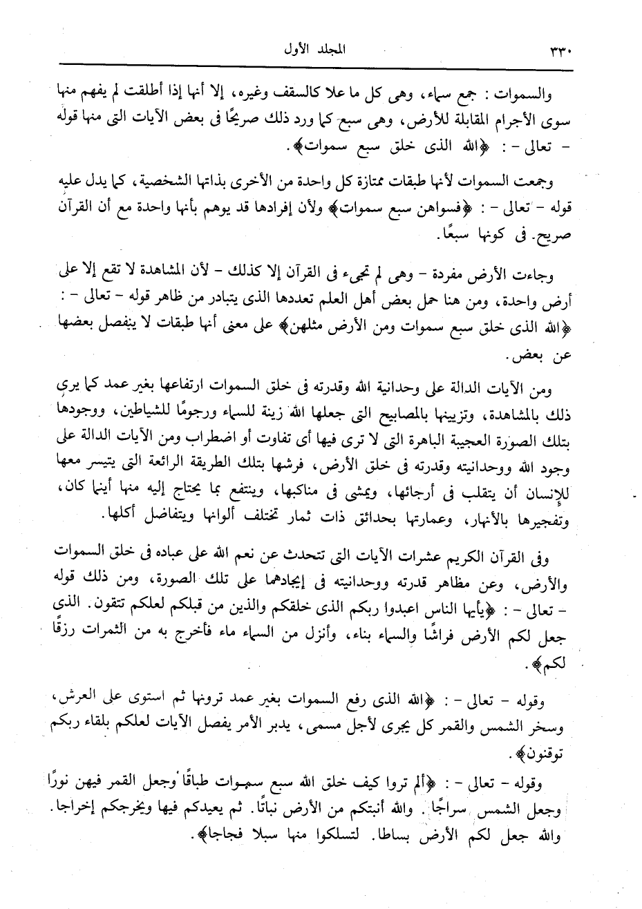 وفي القرآن الكريم عشرات الآيات التي تتحدث عن نعم الله على عباده في خلق السموات والأرض، وعن مظاهر قدرته ووحدانيته في إيجادهما على تلك الصورة، ومن ذلك قوله- تعالى-: يا أَيُّهَا النَّاسُ اعْبُدُوا رَبَّكُمُ الَّذِي خَلَقَكُمْ وَالَّذِينَ مِنْ قَبْلِكُمْ لَعَلَّكُمْ تَتَّقُونَ. الَّذِي جَعَلَ لَكُمُ الْأَرْضَ فِراشاً وَالسَّماءَ بِناءً، وَأَنْزَلَ مِنَ السَّماءِ ماءً فَأَخْرَجَ بِهِ مِنَ الثَّمَراتِ رِزْقاً لَكُمْ.
