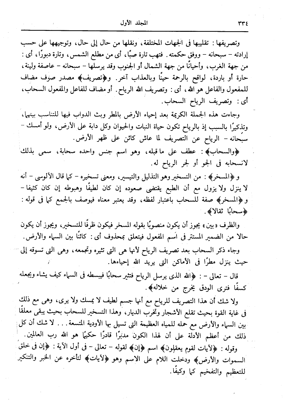 من جهة الغرب، وأحيانا من جهة الشمال أو الجنوب وقد يرسلها- سبحانه- عاصفة ولينة، حارة أو باردة، لواقح بالرحمة حينا وبالعذاب آخر. وتَصْرِيفِ مصدر صرف مضاف للمفعول والفاعل هو الله، أى: وتصريف الله الرياح. أو مضاف للفاعل والمفعول السحاب، أى: وتصريف الرياح السحاب.