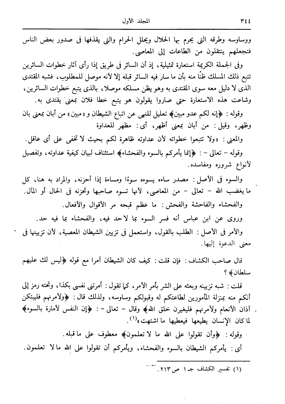 قلت: شبه تزيينه وبعثه على الشر بأمر الآمر، كما تقول: أمرتنى نفسي بكذا، وتحته رمز إلى أنكم منه بمنزلة المأمورين لطاعتكم له وقبولكم وساوسه، ولذلك قال: وَلَآمُرَنَّهُمْ فَلَيُبَتِّكُنَّ آذانَ الْأَنْعامِ وَلَآمُرَنَّهُمْ فَلَيُغَيِّرُنَّ خَلْقَ اللَّهِ وقال- تعالى-: إِنَّ النَّفْسَ لَأَمَّارَةٌ بِالسُّوءِ لما كان الإنسان يطيعها فيعطيها ما اشتهت» «1» .