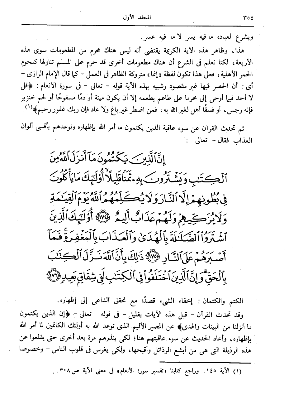 إِنَّ الَّذِينَ يَكْتُمُونَ ما أَنْزَلَ اللَّهُ مِنَ الْكِتابِ وَيَشْتَرُونَ بِهِ ثَمَناً قَلِيلاً أُولئِكَ ما يَأْكُلُونَ فِي بُطُونِهِمْ إِلاَّ النَّارَ وَلا يُكَلِّمُهُمُ اللَّهُ يَوْمَ الْقِيامَةِ وَلا يُزَكِّيهِمْ وَلَهُمْ عَذابٌ أَلِيمٌ (174) أُولئِكَ الَّذِينَ اشْتَرَوُا الضَّلالَةَ بِالْهُدى وَالْعَذابَ بِالْمَغْفِرَةِ فَما أَصْبَرَهُمْ عَلَى النَّارِ (175) ذلِكَ بِأَنَّ اللَّهَ نَزَّلَ الْكِتابَ بِالْحَقِّ وَإِنَّ الَّذِينَ اخْتَلَفُوا فِي الْكِتابِ لَفِي شِقاقٍ بَعِيدٍ (176)