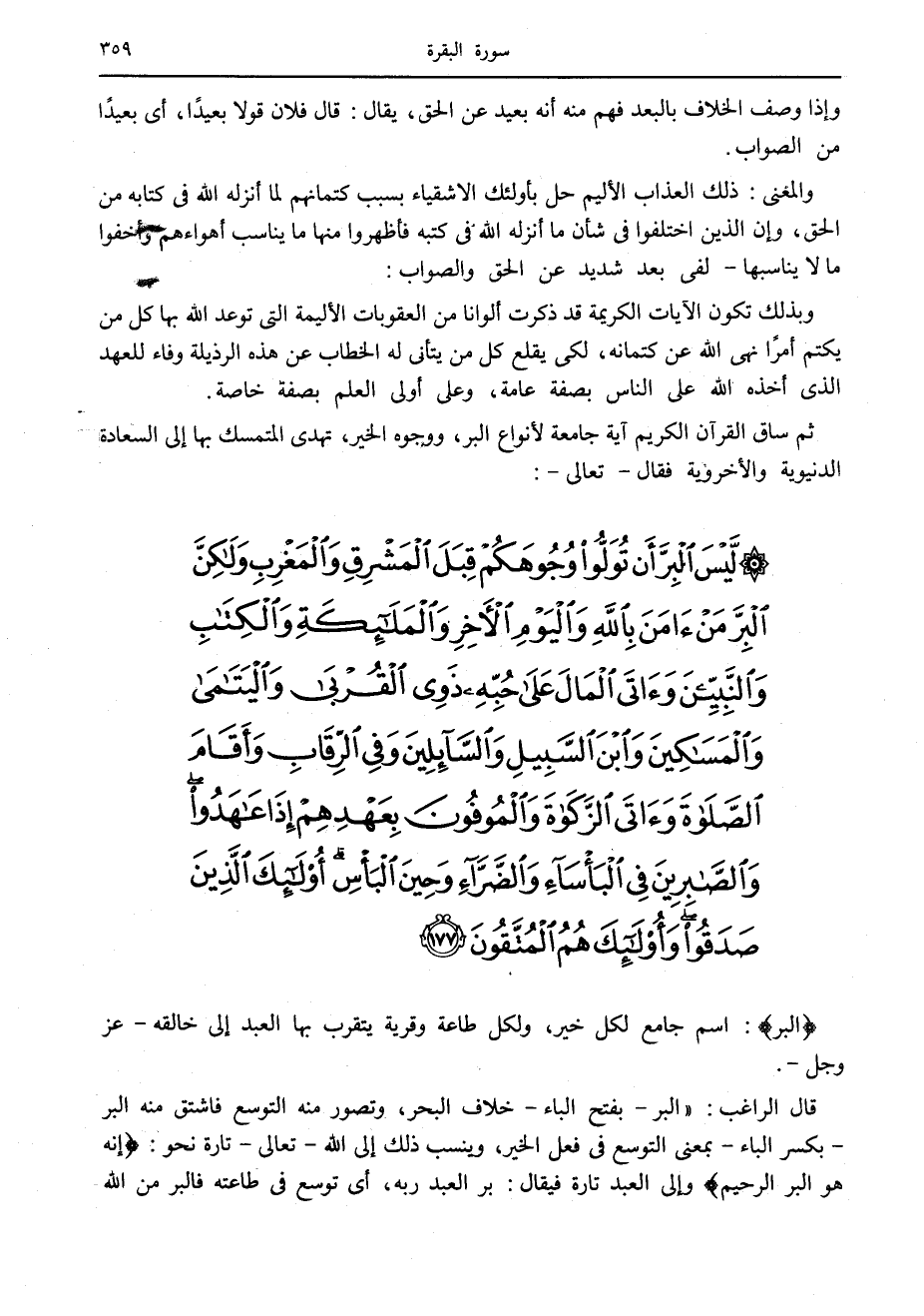 لَيْسَ الْبِرَّ أَنْ تُوَلُّوا وُجُوهَكُمْ قِبَلَ الْمَشْرِقِ وَالْمَغْرِبِ وَلكِنَّ الْبِرَّ مَنْ آمَنَ بِاللَّهِ وَالْيَوْمِ الْآخِرِ وَالْمَلائِكَةِ وَالْكِتابِ وَالنَّبِيِّينَ وَآتَى الْمالَ عَلى حُبِّهِ ذَوِي الْقُرْبى وَالْيَتامى وَالْمَساكِينَ وَابْنَ السَّبِيلِ وَالسَّائِلِينَ وَفِي الرِّقابِ وَأَقامَ الصَّلاةَ وَآتَى الزَّكاةَ وَالْمُوفُونَ بِعَهْدِهِمْ إِذا عاهَدُوا وَالصَّابِرِينَ فِي الْبَأْساءِ وَالضَّرَّاءِ وَحِينَ الْبَأْسِ أُولئِكَ الَّذِينَ صَدَقُوا وَأُولئِكَ هُمُ الْمُتَّقُونَ (177)