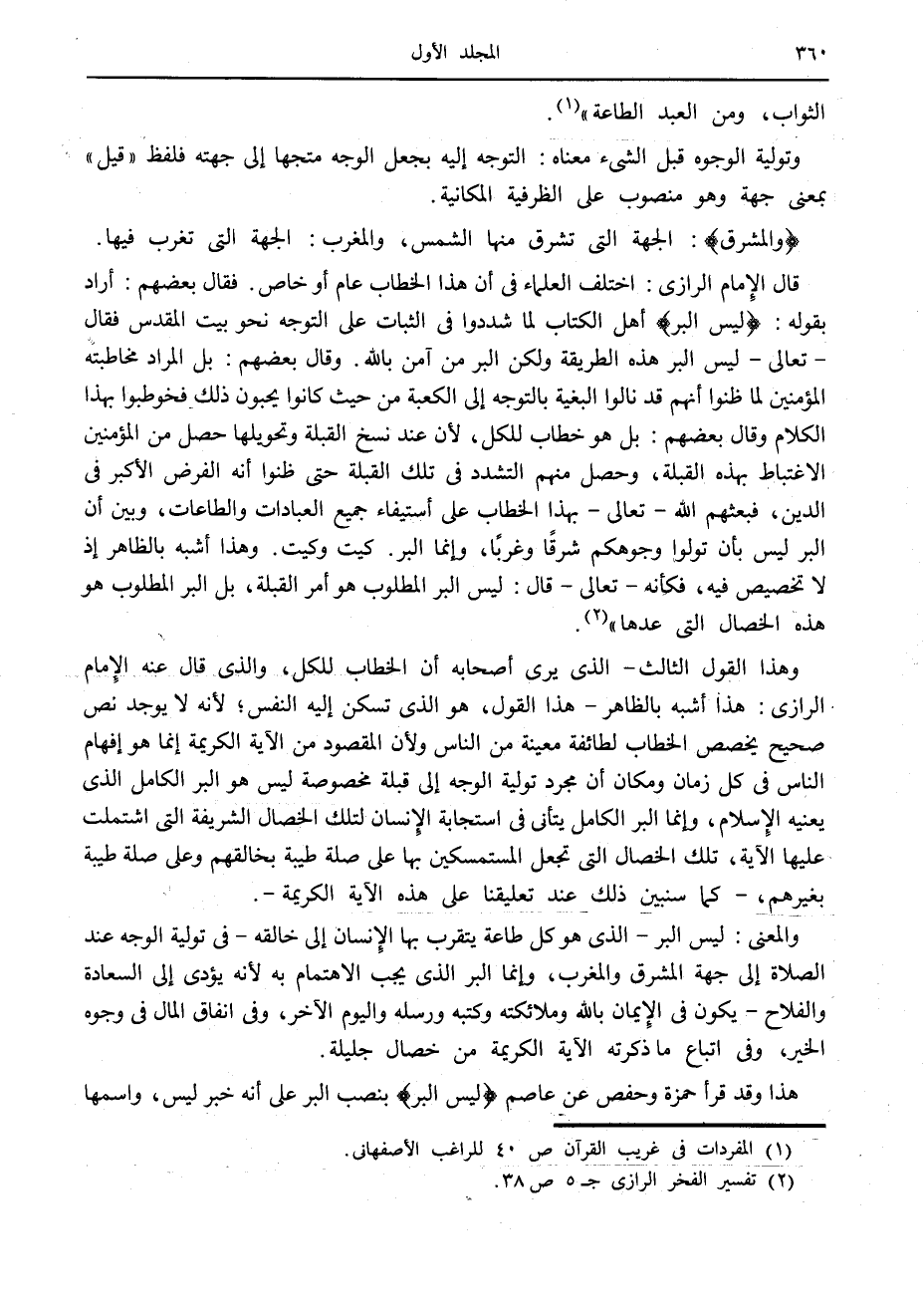 وهذا القول الثالث- الذي يرى أصحابه أن الخطاب للكل، والذي قال عنه الإمام الرازي: هذا أشبه بالظاهر- هذا القول، هو الذي تسكن إليه النفس لأنه لا يوجد نص صحيح يخصص الخطاب لطائفة معينة من الناس ولأن المقصود من الآية الكريمة إنما هو إفهام الناس في كل زمان ومكان أن مجرد تولية الوجه إلى قبلة مخصوصة ليس هو البر الكامل الذي يعنيه الإسلام، وإنما البر الكامل يتأنى في استجابة الإنسان لتلك الخصال الشريفة التي اشتملت عليها الآية، تلك الخصال التي تجعل المستمسكين بها على صلة طيبة بخالقهم وعلى صلة طيبة بغيرهم، - كما سنبين ذلك عند تعليقنا على هذه الآية الكريمة-.
