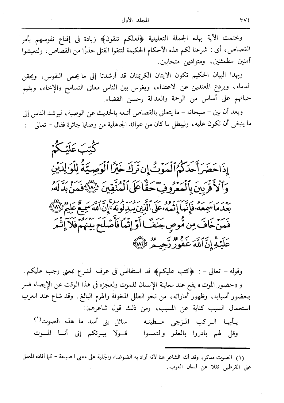 وبعد أن بين- سبحانه- ما يتعلق بالقصاص أتبعه بالحديث عن الوصية، ليرشد الناس إلى ما ينبغي أن تكون عليه، وليبطل ما كان من عوائد الجاهلية من وصايا جائرة فقال- تعالى-: