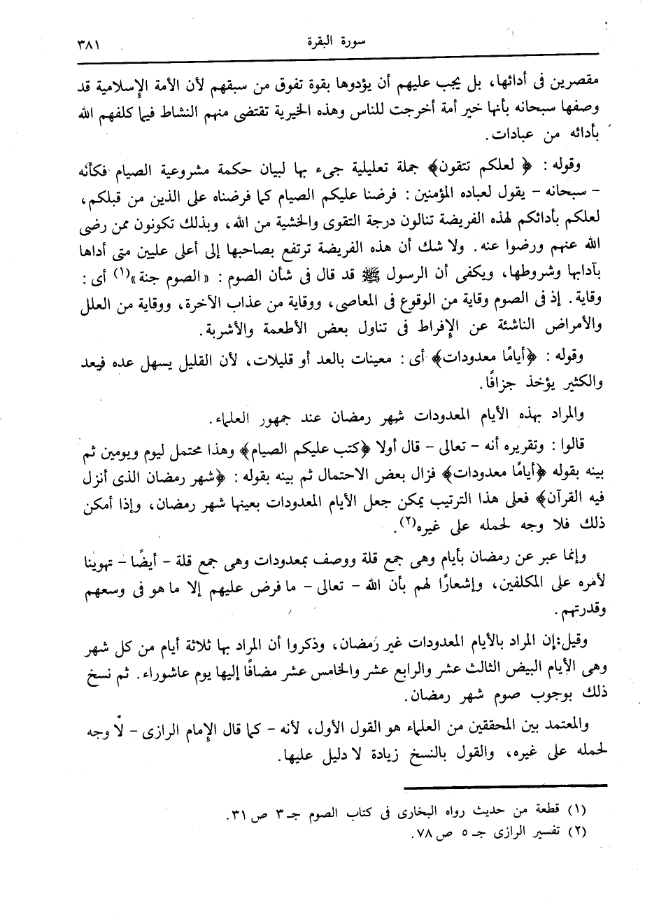 قالوا: وتقريره أنه- تعالى- قال أولا كُتِبَ عَلَيْكُمُ الصِّيامُ وهذا محتمل ليوم ويومين ثم بينه بقوله أَيَّاماً مَعْدُوداتٍ فزال بعض الاحتمال ثم بينه بقوله: شَهْرُ رَمَضانَ الَّذِي أُنْزِلَ فِيهِ الْقُرْآنُ فعلى هذا الترتيب يمكن جعل الأيام المعدودات بعينها شهر رمضان، وإذا أمكن ذلك فلا وجه لحمله على غيره «2» .