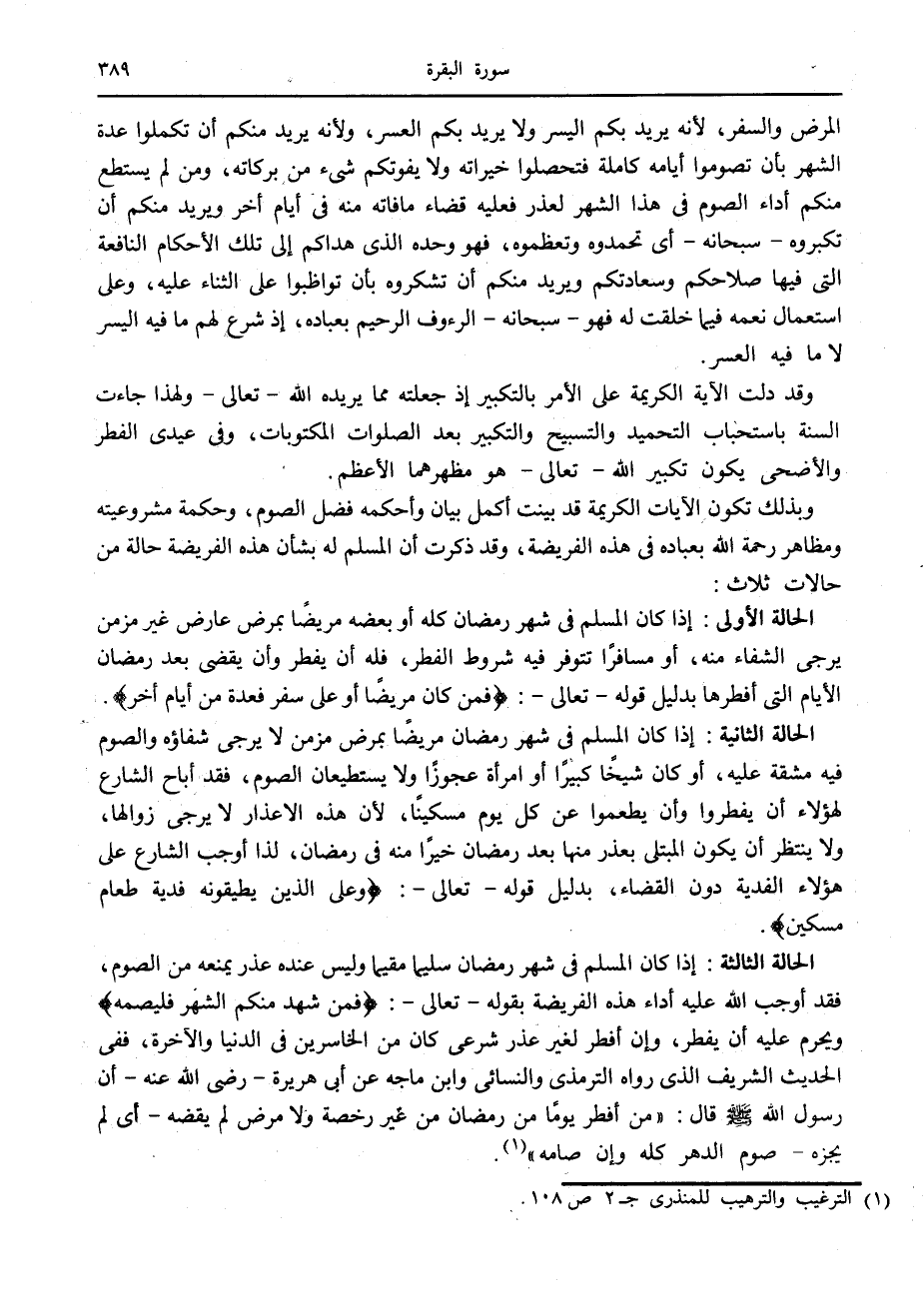 المرض والسفر، لأنه يريد بكم اليسر ولا يريد بكم العسر، ولأنه يريد منكم أن تكملوا عدة الشهر بأن تصوموا أيامه كاملة فتحصلوا خيراته ولا يفوتكم شيء من بركاته، ومن لم يستطع منكم أداء الصوم في هذا الشهر لعذر فعليه قضاء ما فاته منه في أيام أخر ويريد منكم أن تكبروه- سبحانه- أى تحمدوه وتعظموه، فهو وحده الذي هداكم إلى تلك الأحكام النافعة التي فيها صلاحكم وسعادتكم ويريد منكم أن تشكروه بأن تواظبوا على الثناء عليه، وعلى استعمال نعمه فيما خلقت له فهو- سبحانه- الرءوف الرحيم بعباده، إذ شرع لهم ما فيه اليسر لا ما فيه العسر.