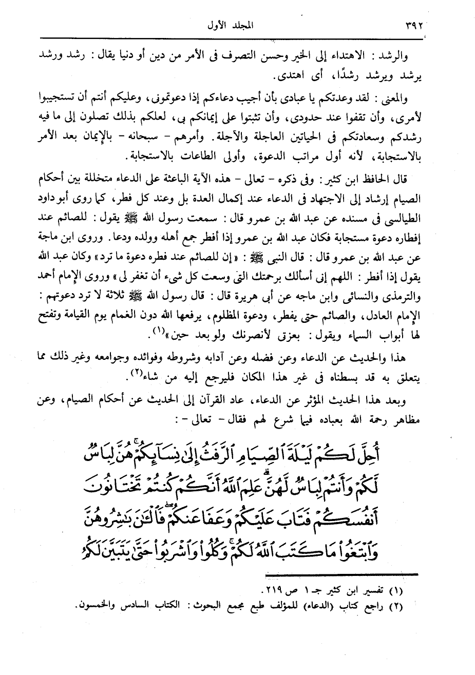 قال الحافظ ابن كثير: وفي ذكره- تعالى- هذه الآية الباعثة على الدعاء متخللة بين أحكام الصيام إرشاد إلى الاجتهاد في الدعاء عند إكمال العدة بل وعند كل فطر، كما روى أبو داود الطيالسي في مسنده عن عبد الله بن عمرو قال: سمعت رسول الله صلّى الله عليه وسلّم يقول: للصائم عند إفطاره دعوة مستجابة فكان عبد الله بن عمرو إذا أفطر جمع أهله وولده ودعا. وروى ابن ماجة عن عبد الله بن عمرو قال: قال النبي صلّى الله عليه وسلّم: «إن للصائم عند فطره دعوة ما ترد» وكان عبد الله يقول إذا أفطر: اللهم إنى أسألك برحمتك التي وسعت كل شيء أن تغفر لي» وروى الإمام أحمد والترمذي والنسائي وابن ماجة عن أبى هريرة قال: قال رسول الله صلّى الله عليه وسلّم ثلاثة لا ترد دعوتهم: