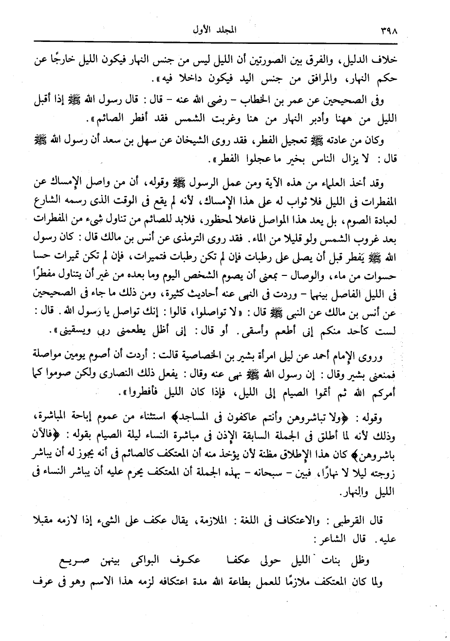 وقد أخذ العلماء من هذه الآية ومن عمل الرسول صلّى الله عليه وسلّم وقوله، أن من واصل الإمساك عن المفطرات في الليل فلا ثواب له على هذا الإمساك، لأنه لم يقع في الوقت الذي رسمه الشارع لعبادة الصوم، بل يعد هذا المواصل فاعلا لمحظور، فلا بد للصائم من تناول شيء من المفطرات بعد غروب الشمس ولو قليلا من الماء. فقد روى الترمذي عن أنس بن مالك قال: كان رسول الله صلّى الله عليه وسلّم يفطر قبل أن يصلّى على رطبات فإن لم تكن رطبات فتميرات، فإن لم تكن تميرات حسا حسوات من ماء، والوصال- بمعنى أن يصوم الشخص اليوم وما بعده من غير أن يتناول مفطرا في الليل الفاصل بينهما- وردت في النهى عنه أحاديث كثيرة، ومن ذلك ما جاء في الصحيحين عن أنس بن مالك عن النبي صلّى الله عليه وسلّم قال: «لا تواصلوا، قالوا: إنك تواصل يا رسول الله. قال: