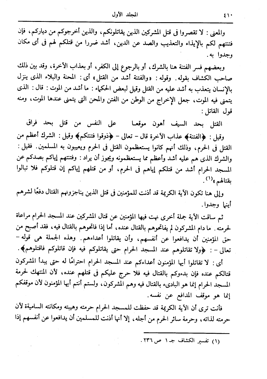 وبعضهم فسر الفتنة هنا بالشرك، أو بالرجوع إلى الكفر، أو بعذاب الآخرة، وقد بين ذلك صاحب الكشاف بقوله. وقوله: «والفتنة أشد من القتل» أى: المحنة والبلاء الذي ينزل بالإنسان يتعذب به أشد عليه من القتل وقيل لبعض الحكماء: ما أشد من الموت: قال: الذي يتمنى فيه الموت، جعل الإخراج من الوطن من الفتن والمحن التي يتمنى عندها الموت، ومنه قول القاتل: