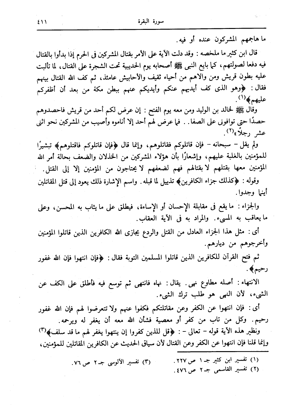 قال ابن كثير ما ملخصه: وقد دلت الآية على الأمر بقتال المشركين في الحرم إذا بدءوا بالقتال فيه دفعا لصولتهم، كما بايع النبي صلّى الله عليه وسلّم أصحابه يوم الحديبية تحت الشجرة على القتال، لما تألبت عليه بطون قريش ومن والاهم من أحياء ثقيف والأحابيش عامئذ، ثم كف الله القتال بينهم فقال: وَهُوَ الَّذِي كَفَّ أَيْدِيَهُمْ عَنْكُمْ وَأَيْدِيَكُمْ عَنْهُمْ بِبَطْنِ مَكَّةَ مِنْ بَعْدِ أَنْ أَظْفَرَكُمْ عَلَيْهِمْ «1» .