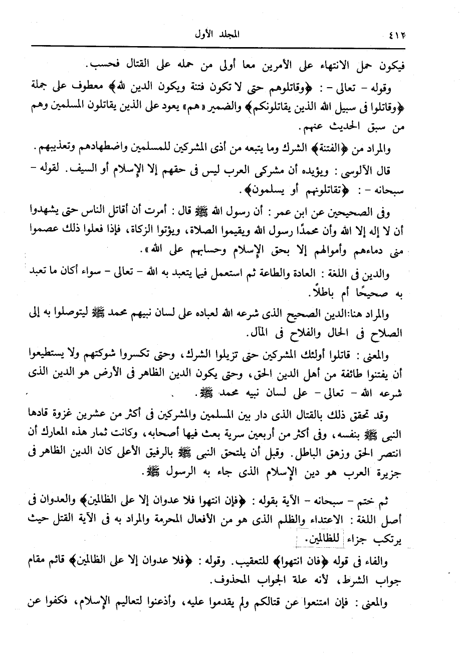 والمعنى: قاتلوا أولئك المشركين حتى تزيلوا الشرك، وحتى تكسروا شوكتهم ولا يستطيعوا أن يفتنوا طائفة من أهل الدين الحق، وحتى يكون الدين الظاهر في الأرض هو الدين الذي شرعه الله- تعالى- على لسان نبيه محمد صلّى الله عليه وسلّم.