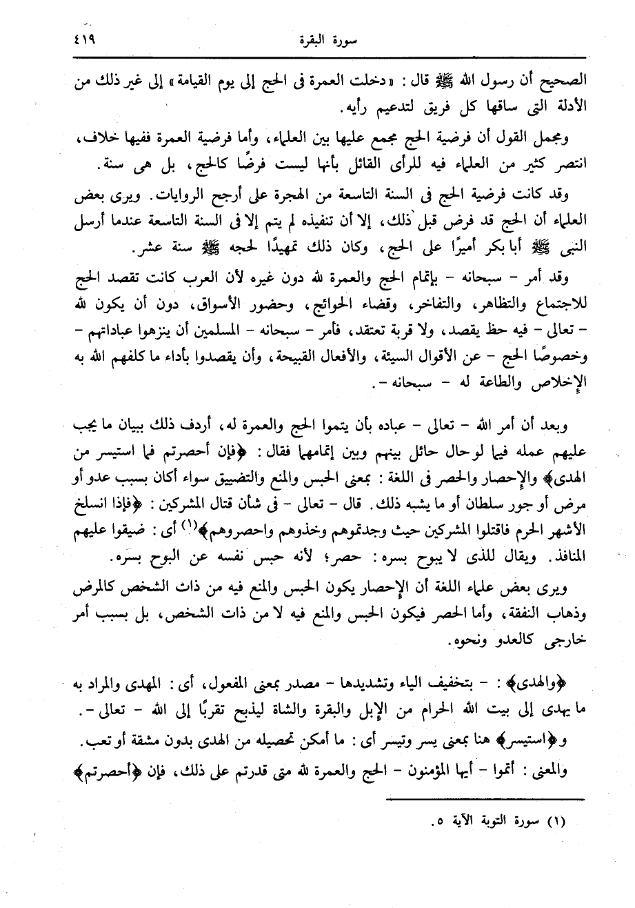 وبعد أن أمر الله- تعالى- عباده بأن يتموا الحج والعمرة له، أردف ذلك ببيان ما يجب عليهم عمله فيما لو حال حائل بينهم وبين إتمامهما فقال: فَإِنْ أُحْصِرْتُمْ فَمَا اسْتَيْسَرَ مِنَ الْهَدْيِ والإحصار والحصر في اللغة: بمعنى الحبس والمنع والتضييق سواء أكان بسبب عدو أو مرض أو جور سلطان أو ما يشبه ذلك. قال- تعالى- في شأن قتال المشركين: فَإِذَا انْسَلَخَ الْأَشْهُرُ الْحُرُمُ فَاقْتُلُوا الْمُشْرِكِينَ حَيْثُ وَجَدْتُمُوهُمْ وَخُذُوهُمْ وَاحْصُرُوهُمْ «1» أى: ضيقوا عليهم المنافذ. ويقال للذي لا يبوح بسره: حصر لأنه حبس نفسه عن البوح بسره.